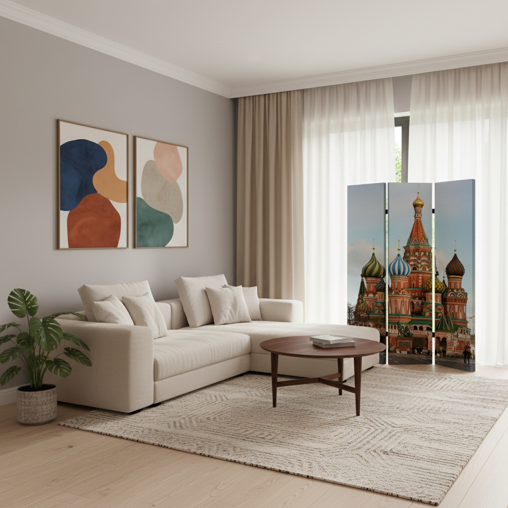 The 72-inch red blue and ivory canvas folding three panel screen room divider is an exquisite way to enhance your living space. Crafted with a combination of solid and manufactured wood, it ensures durability while providing an elegant aesthetic. The elegant canvas material adds a soft texture, perfect for creating a cozy atmosphere. This room divider boasts an opaque design, offering privacy without sacrificing style. With three panels, it provides ample coverage, making it ideal for separating areas in larger rooms or adding a decorative touch to smaller spaces. Its folding capability allows for easy storage and repositioning, adapting seamlessly to your home decor needs. 72.00-inch h x 48.00-inch w x 1.00-inch d.