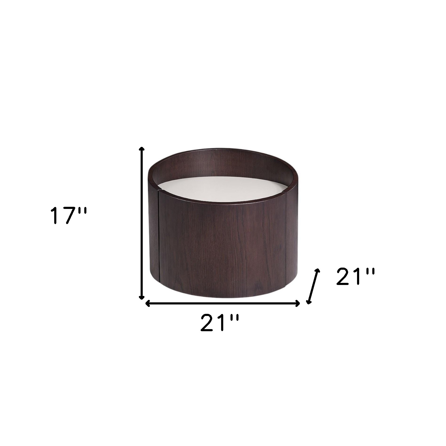 The 21" Round Modern Brown Oak Finish End or Side Table is truly unique and stunning. This table features a sleek, smooth design with a unique sunken grey gloss finish top. Excellently crafted, this modern design can be a nightstand, end table, side table, or small coffee table. Measuring 17" x 21" x 21" this table presents sturdy and unique design and construction that will completely transform your living space with its contemporary style.