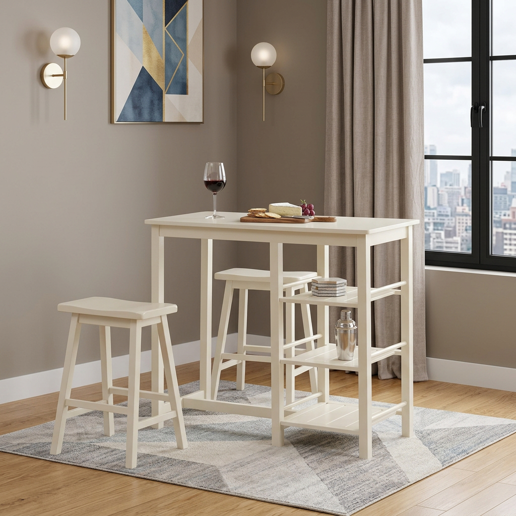 The three piece cream solid wood counter height bar table set offers a perfect blend of elegance and functionality. Its rectangular shape with shelving down the side provides ample space for dining or socializing with friends and family. Crafted from solid wood, both the top and base showcase a stunning cream beige hue that enhances any decor. This transitional farmhouse style piece effortlessly complements various interior designs, bringing warmth and sophistication to your bar or restaurant area. 36.00-inch h x 43.00-inch w x 19.00-inch d.