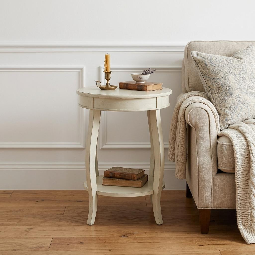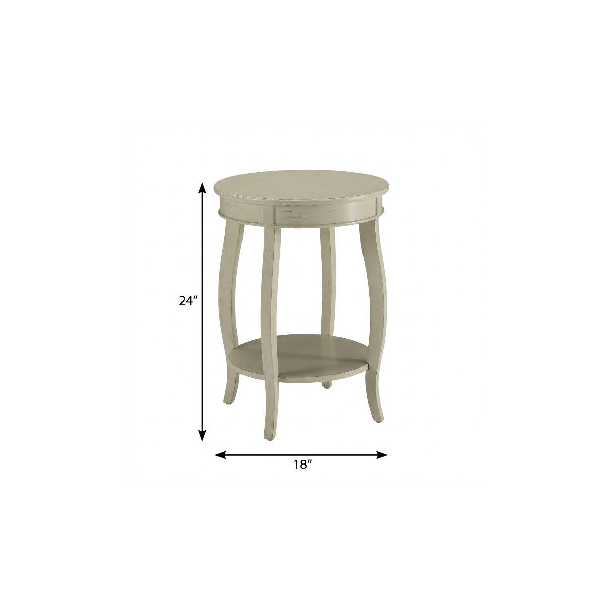 Show off your exquisite taste with this 24" white solid wood round end table with shelf. Made of solid wood, the white coloration throughout gives this piece an updated and refreshing look. Includes a single shelf for handy storage or display space. A great accent on either side of the sofa or bed, this adorable end or side table is just what you need. This versatile table is a great accent for most any room. 24" H x 18" W x 18" D