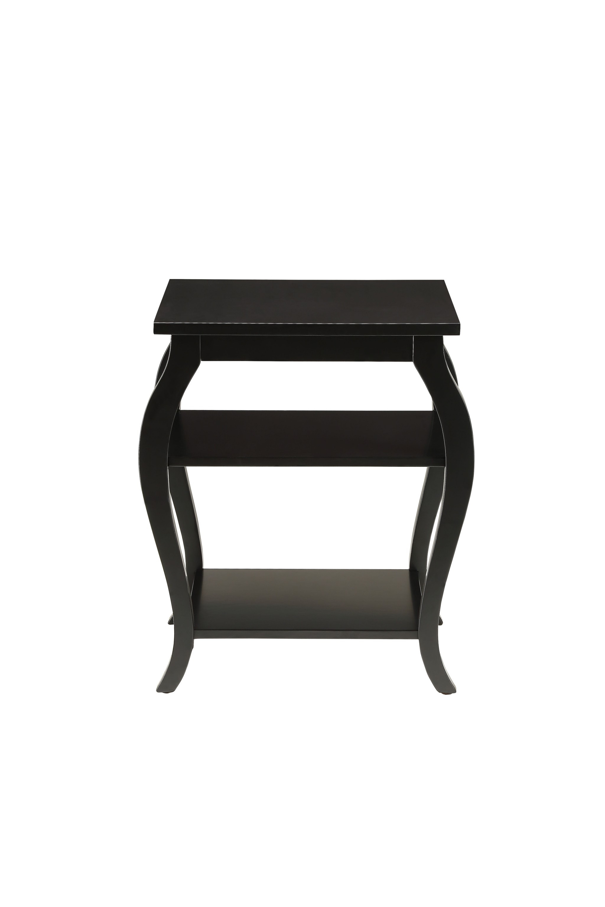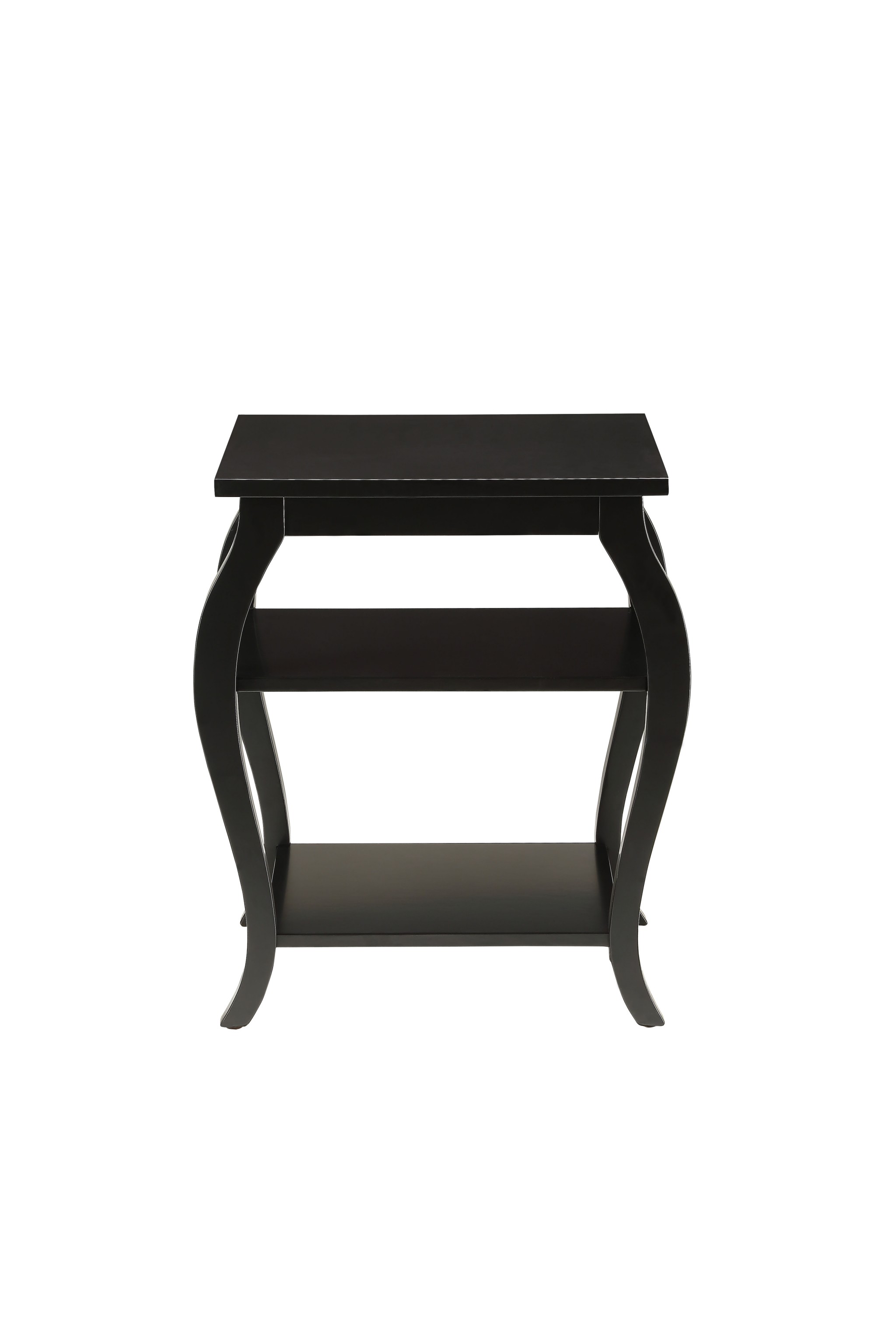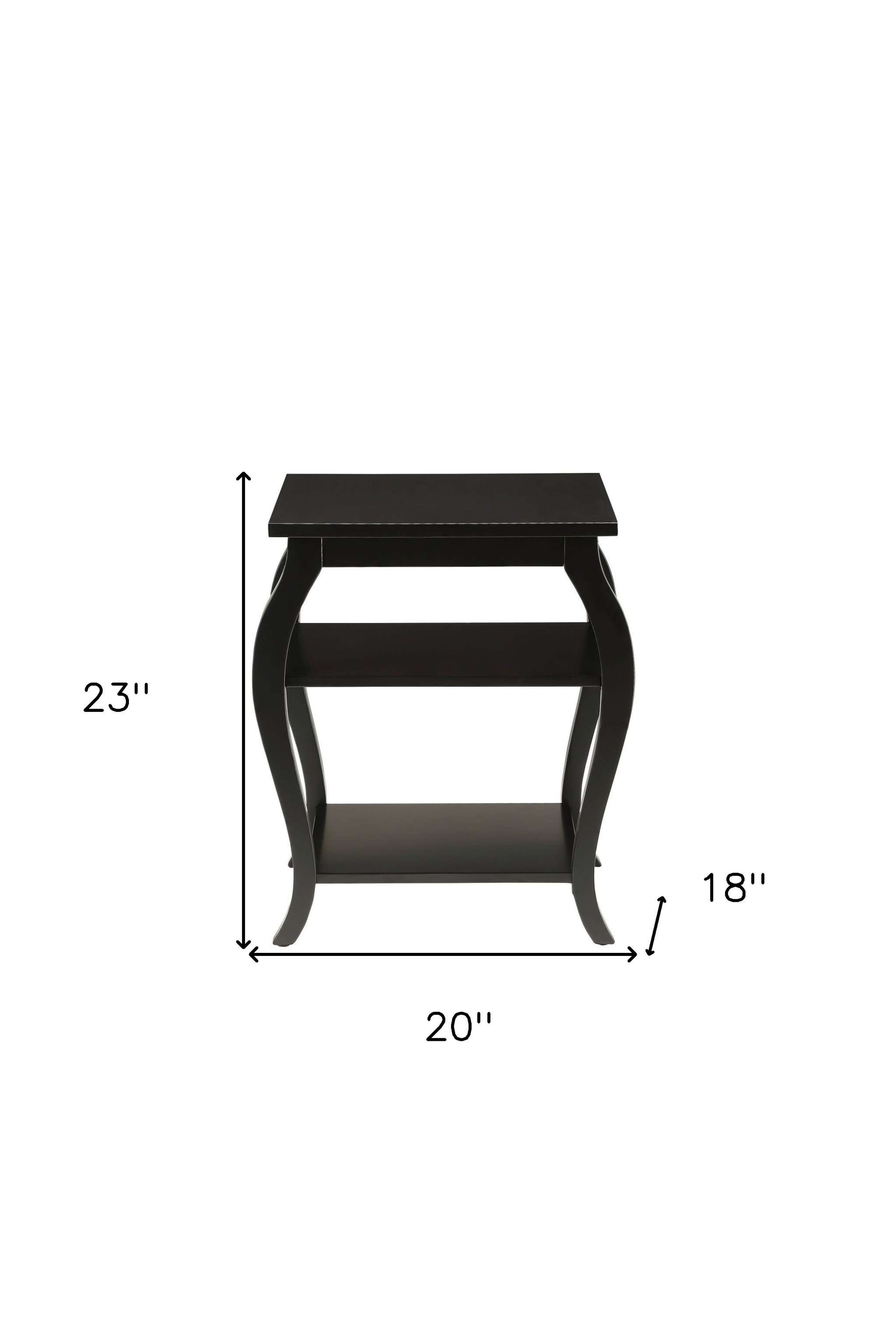 Optimize your space and add some charm to your room with the 23-inch black wood bow leg end table with two shelves. The chic appearance of this unique table will brighten and up your room and is versatile to work as an end table, side table, or nightstand. Two bottom shelves add additional storage and display while the overall piece takes up a small footprint. Features include a rectangular top, and stylish wooden cabriole/bowed legs. 23-inch H x 20-inch W x 18-inch D