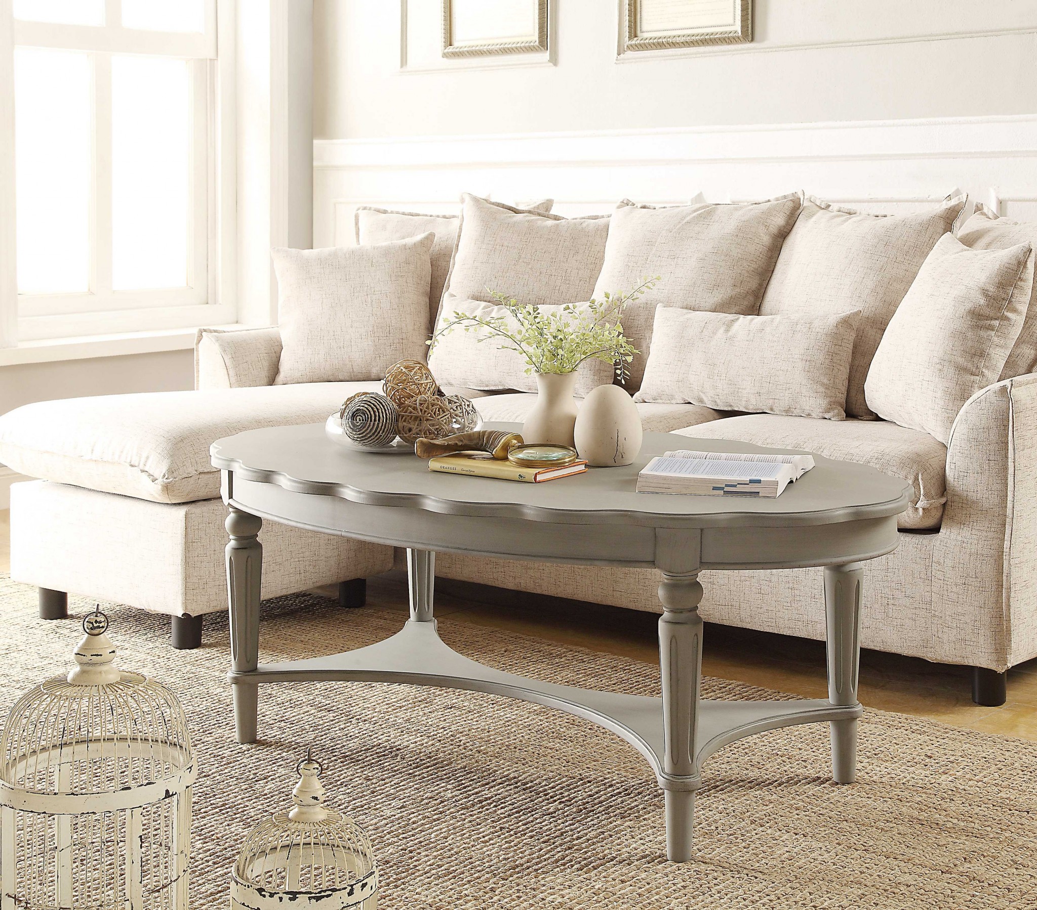 This stylish 50-inch antiqued white solid wood oval distressed coffee table is not only practical, but good looking and built to last. This table is made from solid wood in a antiqued white color throughout the base and top. The purposefully distressed finish gives this table an authentically rustic feel. This oval table with a scalloped edge top surface is an updated take on a classic. It has an attractive design that will definitely breathe some fresh air into your interior. 19-inch h x 50-inch w x 28-inch d.