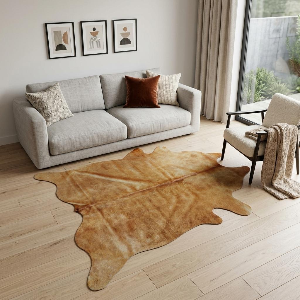 Add some artistry to your room with this 6-foot x 7-foot golden brown cowhide area rug. Ideal for spaces with kids and pets, this rug is stain resistant to help repel dirt and spilled liquids. Crafted from cowhide fibers that give this piece premium texture, refinement, and appeal. Rugs are a great way to showcase your style, hide imperfections, warm your home and reduce noise. This larger sized, modern styled rug is ready to create a focal point or statement piece in your room. 72-inch h x 84-inch w x 0.25-inch d.