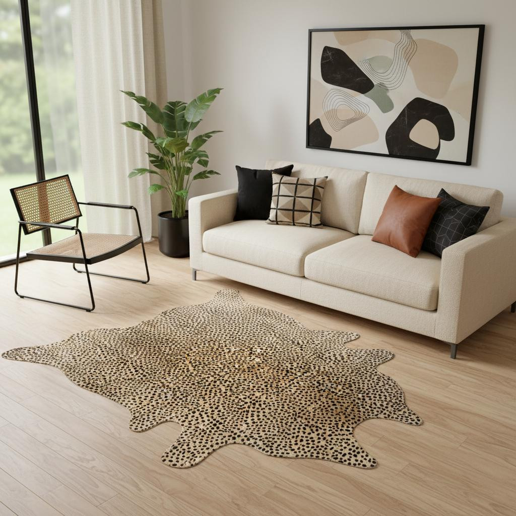 This 6-foot x 7-foot brown and black cowhide cheetah print area rug, is a great way to add warmth to a room. Crafted from cowhide fibers that give this piece premium texture, refinement, and appeal. Rugs are a great way to showcase your style, hide imperfections, warm your home and reduce noise. This larger sized, contemporary styled rug is ready to create a focal point or statement piece in your room. 72-inch h x 84-inch w x 0.25-inch d.