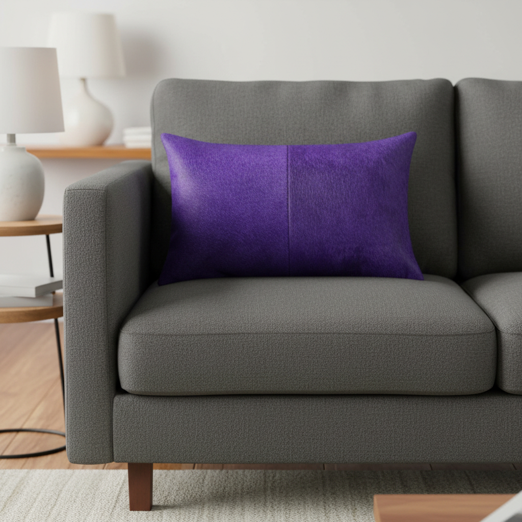 Indulge in the sumptuous feel and decadent softness of this stunning square Hand Stitched Purple Natural Cowhide Decorative Lumbar Shaped Accent Pillow. Bold and beautiful this luxurious pillow is hand-cut and stitched from 100% genuine cowhide. A soft micro suede backing and soft polyfil insert helps to add warmth and comfort while the hidden zipper closure makes it convenient and easy to remove if necessary. Create a stunning look in your family room, living room or bedroom with this naturally soft and smooth cowhide pillow. Since this is a naturally made product, size and or exact color may vary slightly. Professional dry cleaning is recommended. 5" X 12" x 20"