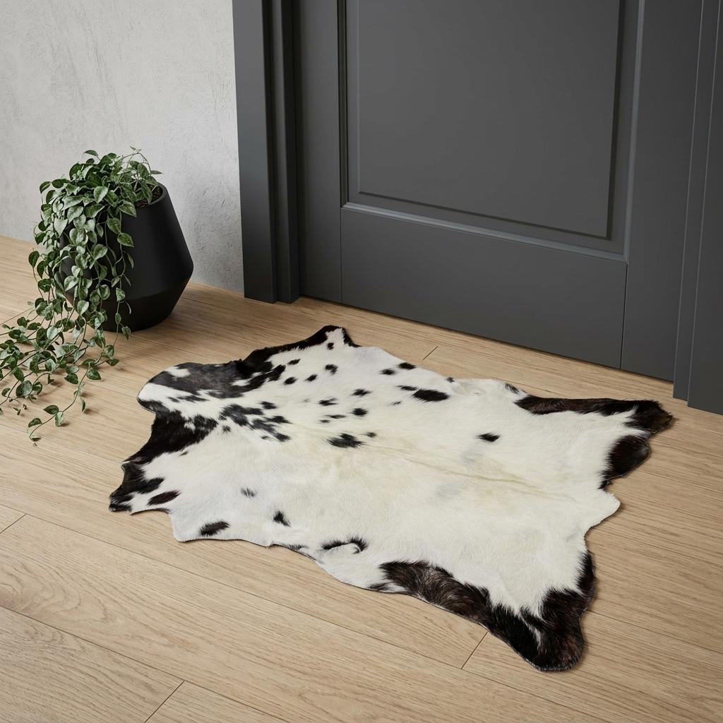 Add some artistry to your room with this 2-foot x 3-foot black and white cowhide cowhide print hand woven area rug. Crafted by skilled artisans, this hand woven rug is genuine and unique. No two will be exactly alike. Crafted from cowhide fibers that give this piece premium texture, refinement, and appeal. Rugs are a great way to showcase your style, hide imperfections, warm your home and reduce noise. This smaller sized, contemporary styled rug is just what you need for your walkway, bedside, in front of door, cabinet, refrigerator, or chair. 24-inch h x 36-inch w x 0.25-inch d.