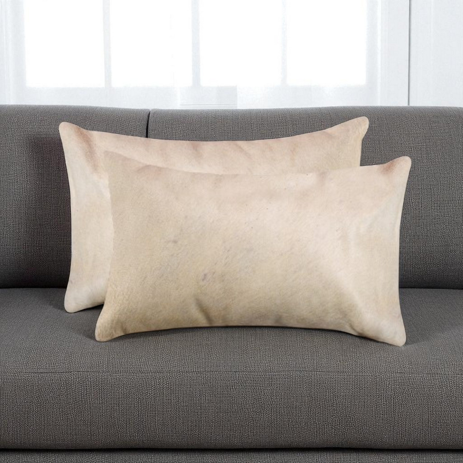 This set of two 12-inch x 20-inch tan cowhide throw pillows will add a beautiful decorative accent to your decor. The luxurious tan coloring of the genuine cowhide on these pillows will add dimension and texture to your space. Elegantly chic, these pillows are the epitome of luxury. Super soft and built to hold its shape, this cotton-filled pillow is a great option. Great to use on its own or mix with other decorations for the perfect look. A great decorative accessory to add color and dimension to your favorite chair, accent your sofa, or to use as part of your bed ensemble. 12-inch h x 20-inch w x 5-inch d.