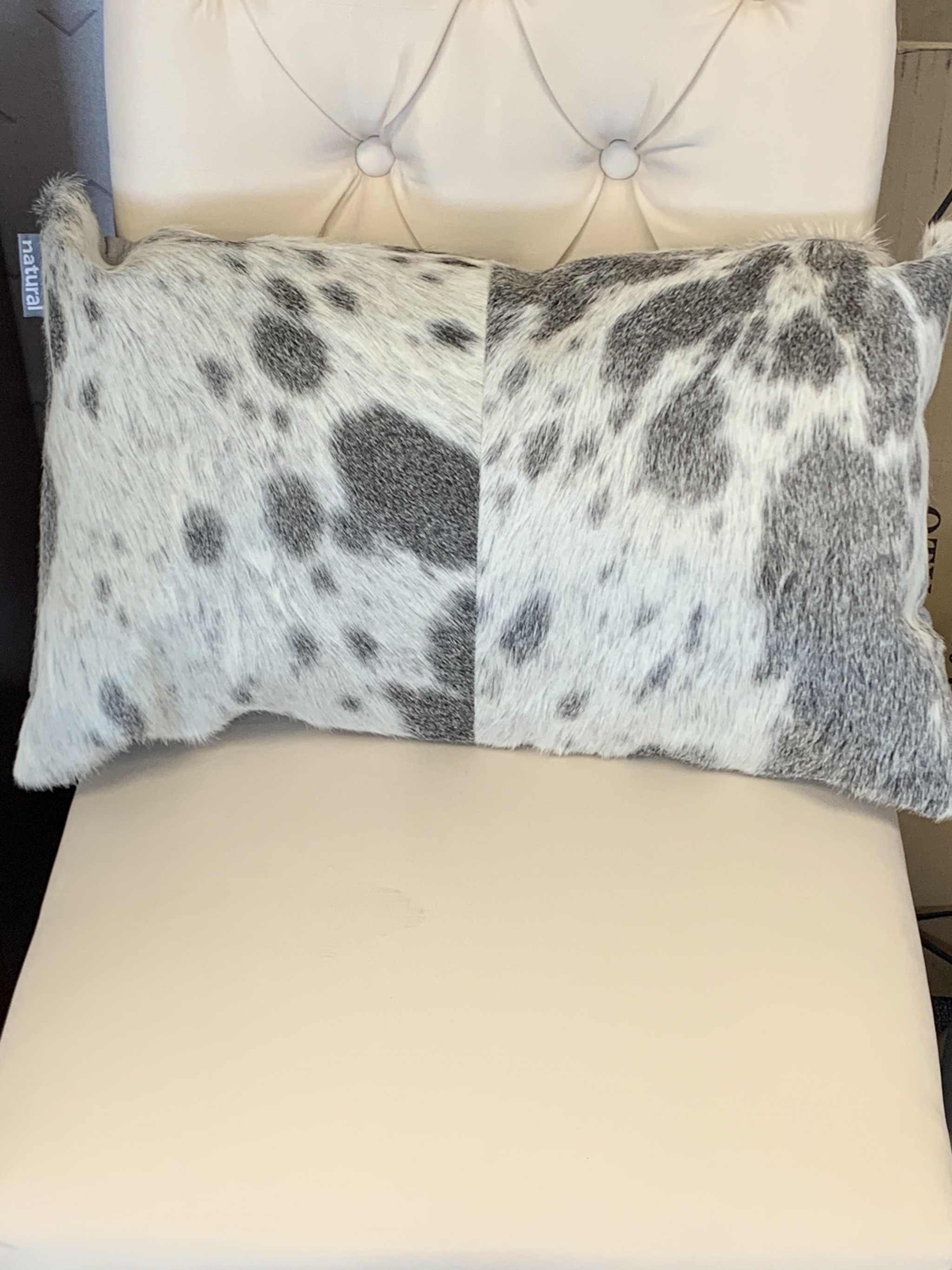 Spice up your room with our Gray And White Natural Cowhide Pillows. Designed with the essence of luxury, these lumbar decorative throw pillows are made only from the finest natural cowhide that prides itself on a naturally soft and smooth pile depth of color. Each pillow is hand stitched by skilled artisans, has a soft microsude backing, and features a concealed zipper closure that allows for easy removal for cleaning. Enjoy the luxuriousness and uniqueness of genuine natural cowhide with these durable and enduring pillows. No two will be exactly. Set of 2 12" x 20" x 5"
