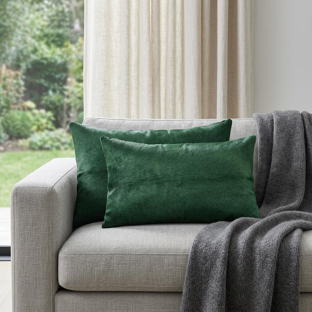 Unique and decorative, this comfortable set of two 12-inch x 20-inch green cowhide throw pillow will leave a lasting impression. The luxurious green coloring of the genuine cowhide on these pillows will add dimension and texture to your space. Elegantly chic, these pillows are the epitome of luxury. This soft cotton pillow not only is decorative but made to be comfy and cozy all day long. For anyone that loves to decorate or accent their space with color and texture. A great decorative accessory for your favorite chair, to accent your sofa, or to use as part of your bed ensemble. 12-inch H x 20-inch W x 5-inch D