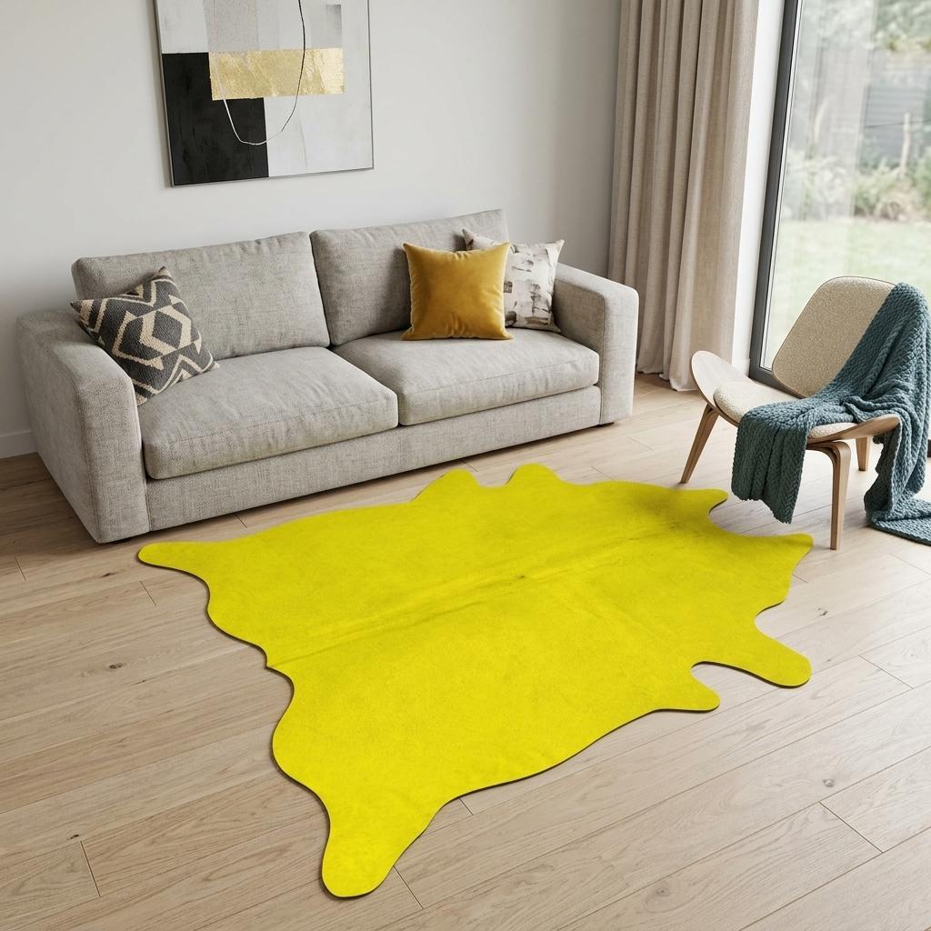 Add great coloration and comfortable texture to your space with this 5-foot x 7-foot yellow cowhide area rug. Crafted from cowhide fibers that give this piece premium texture, refinement, and appeal. Rugs are a great way to showcase your style, hide imperfections, warm your home and reduce noise. This larger sized, contemporary styled rug is ready to create a focal point or statement piece in your room. 60-inch h x 84-inch w x 0.25-inch d.