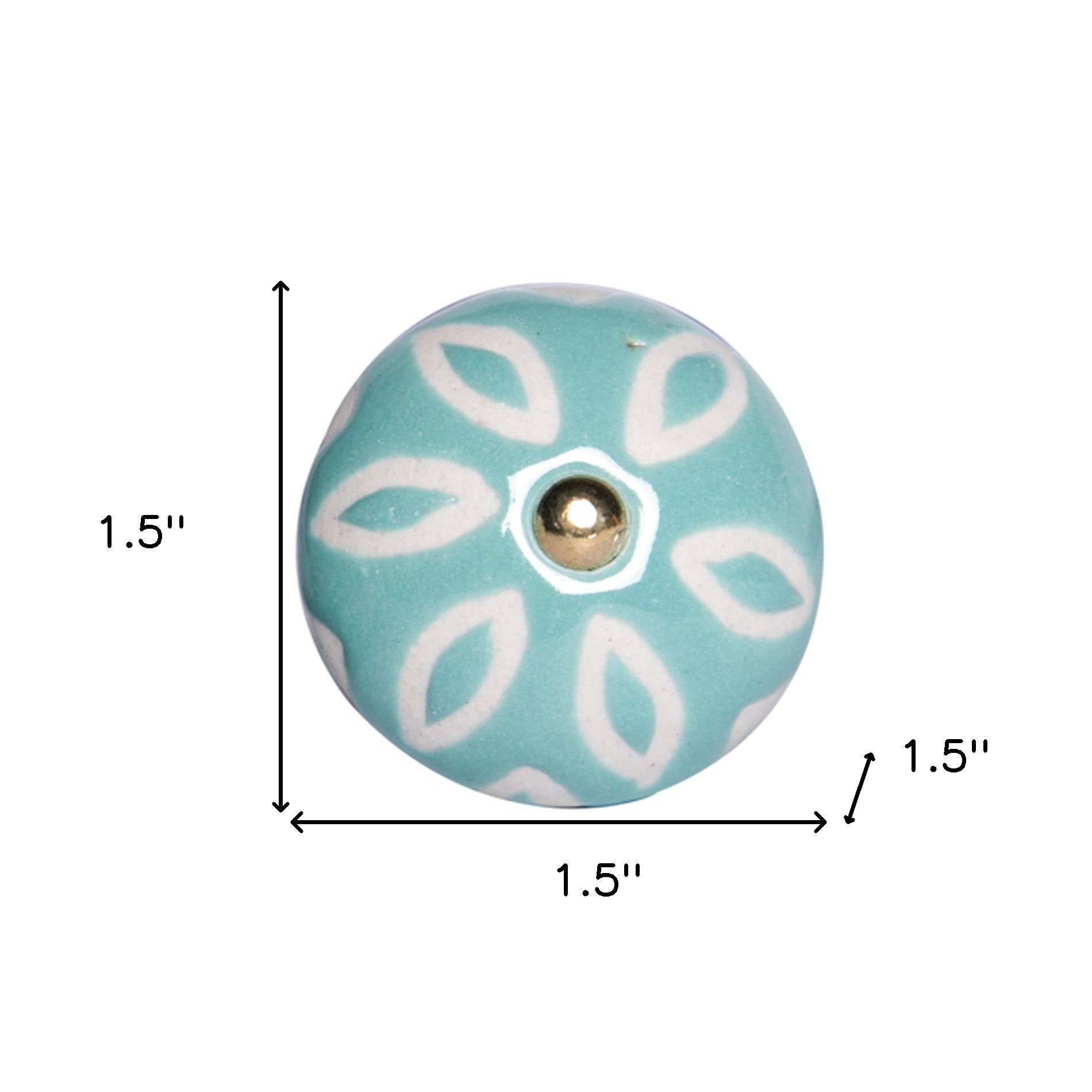 Upgrade your space with a high end look with this set of twelve aqua and white geometric ceramic drawer pull knobs. Improve the look of your old boring or builder grade furniture and cabinetry with these high quality round knob traditional style knobs. Hand-painted by talented artisans, these knobs will add a touch of artisanal design. 1.5-inch h x 1.5-inch w x 1.5-inch d.