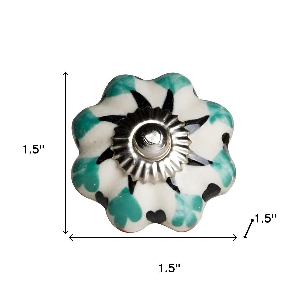 Transform your space quickly and easily with this set of twelve green silver and white geometric ceramic drawer pull knobs. A favorite of designers and diyer's alike, these high quality round knob transitional style knobs are versatile in use and will change up the look of your existing furniture and cabinetry in a snap. Hand-painted by talented artisans, these knobs will add a touch of artisanal design. 1.5-inch h x 1.5-inch w x 1.5-inch d.