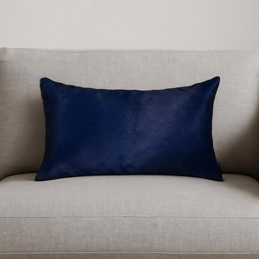 Bring a bit of fashion and zip to your space with this eye-catching and comfy 12-inch x 20-inch navy cowhide throw pillow. This navy hued piece represents the highest quality construction, expertly made from premium and genuine cowhide. Elegantly chic, this pillow is the epitome of luxury. Super soft and built to hold its shape, this cotton pillow is a great option. For anyone that loves to decorate or accent their space with color and texture. A great decorative accessory for your favorite chair, to accent your sofa, or to use as part of your bed ensemble. 12-inch H x 20-inch W x 5-inch D