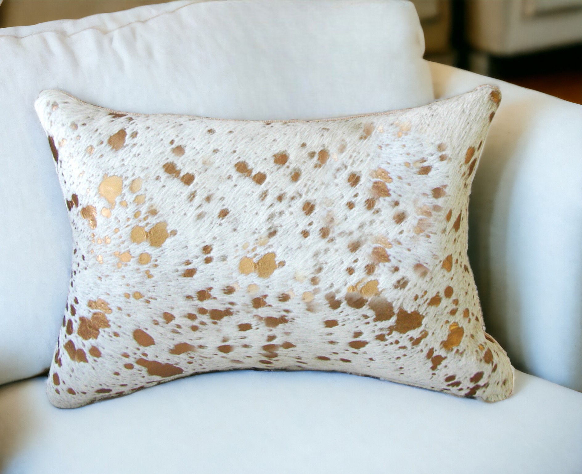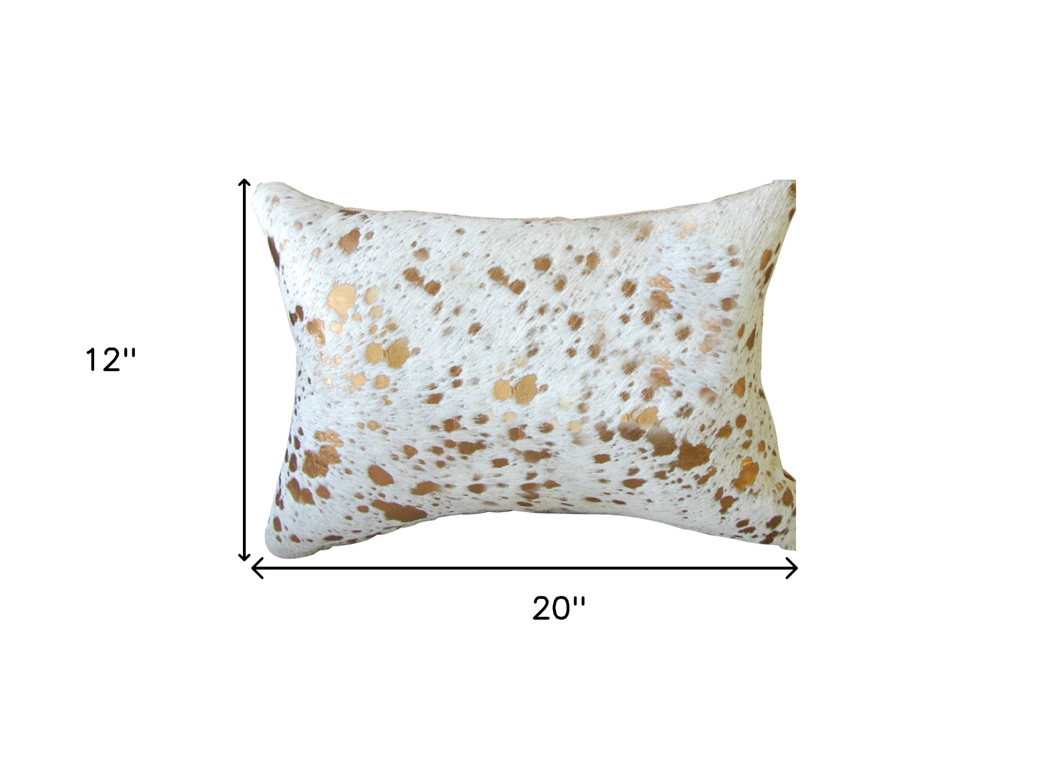 Bring a bit of fashion and zip to your space with this eye-catching and comfy 12-inch x 20-inch natural & gold cowhide throw pillow. The luxurious natural & gold coloring of the genuine cowhide will add dimension and texture to your space. Elegantly chic, this pillow is the epitome of luxury. Super soft and built to hold its shape, this cotton pillow is a great option. For anyone that loves to decorate or accent their space with color and texture. A great decorative accessory for your favorite chair, to accent your sofa, or to use as part of your bed ensemble. 12-inch H x 20-inch W x 5-inch D
