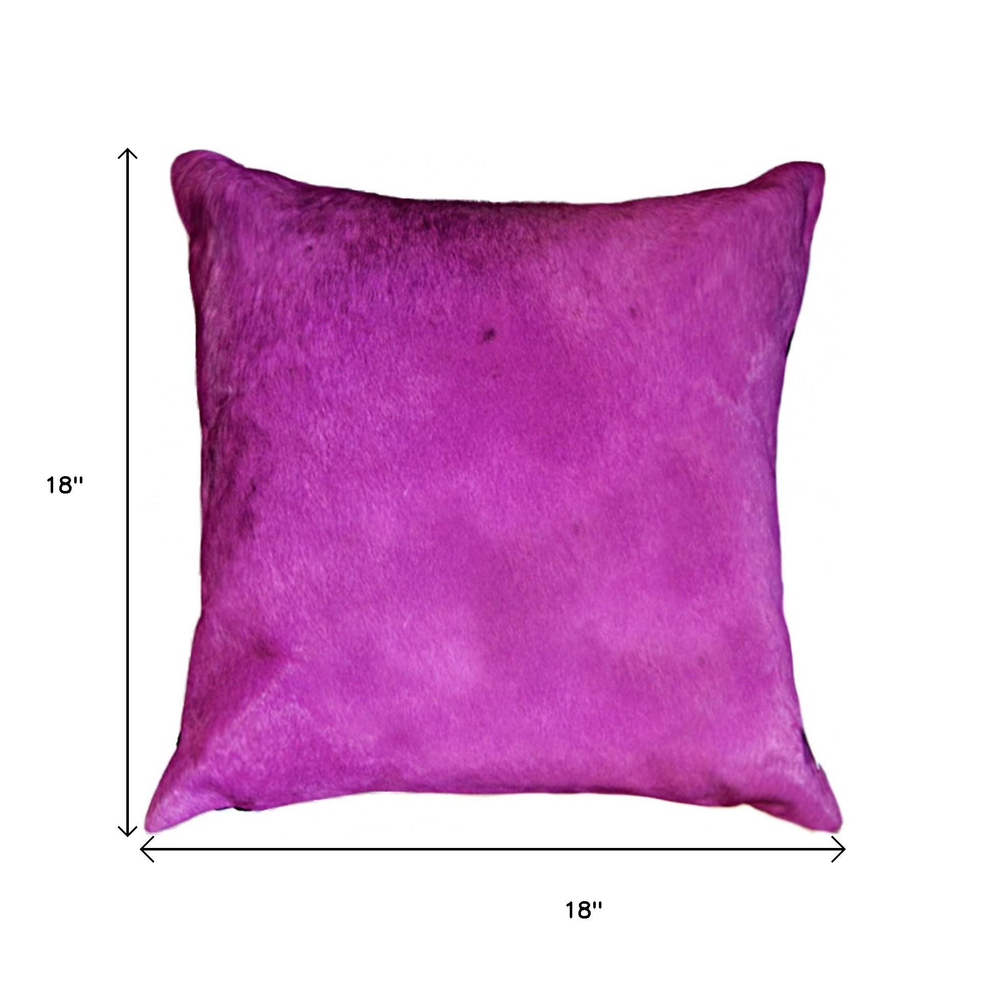 Unique and decorative, this comfortable 18-inch purple cowhide cowhide throw pillow will leave a lasting impression. Super soft and built to hold its shape, this cotton-filled pillow is a great option. Great to use on its own or mix with other decorations for the perfect look. Decorative throw pillows not only add color and dimension to your space but can be comfy and supportive when you are lounging and cuddling as well. 18-inch h x 18-inch w x 5-inch d.
