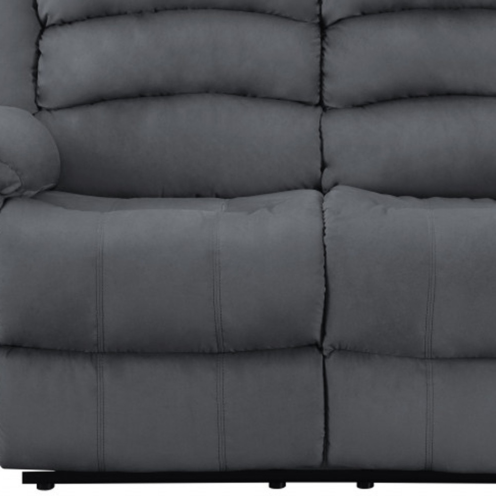 Add a dreamy soft and comfortable seating option to your space with this fabulous 60-inch gray microfiber power reclining loveseat. Pillow top arms offer a comfy place to rest and give this piece some interest and shape. Designed with a reclining feature, this love seat provides the ultimate relaxation experience. The solid and manufactured wood frame ensures durability, while the cushion back adds extra comfort to your seating. 40-inch H x 60-inch W x 35-inch D