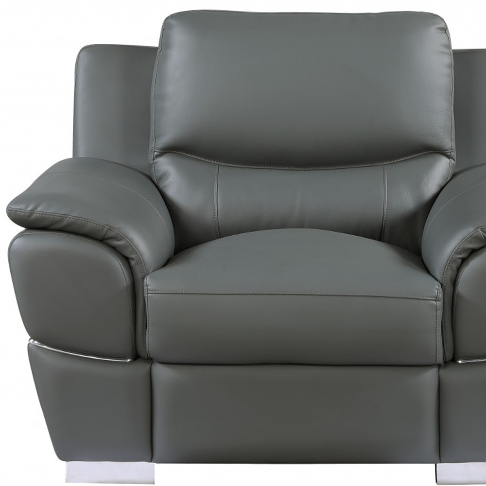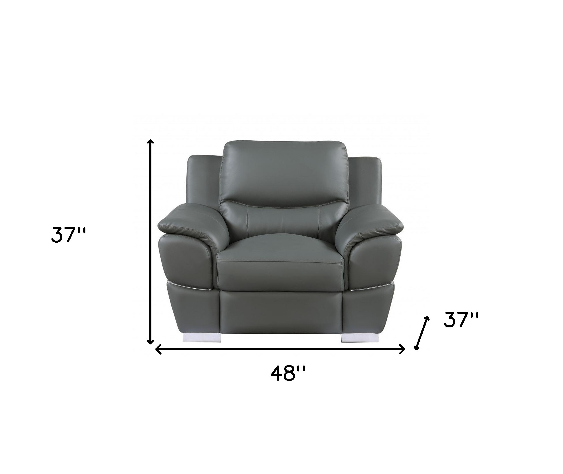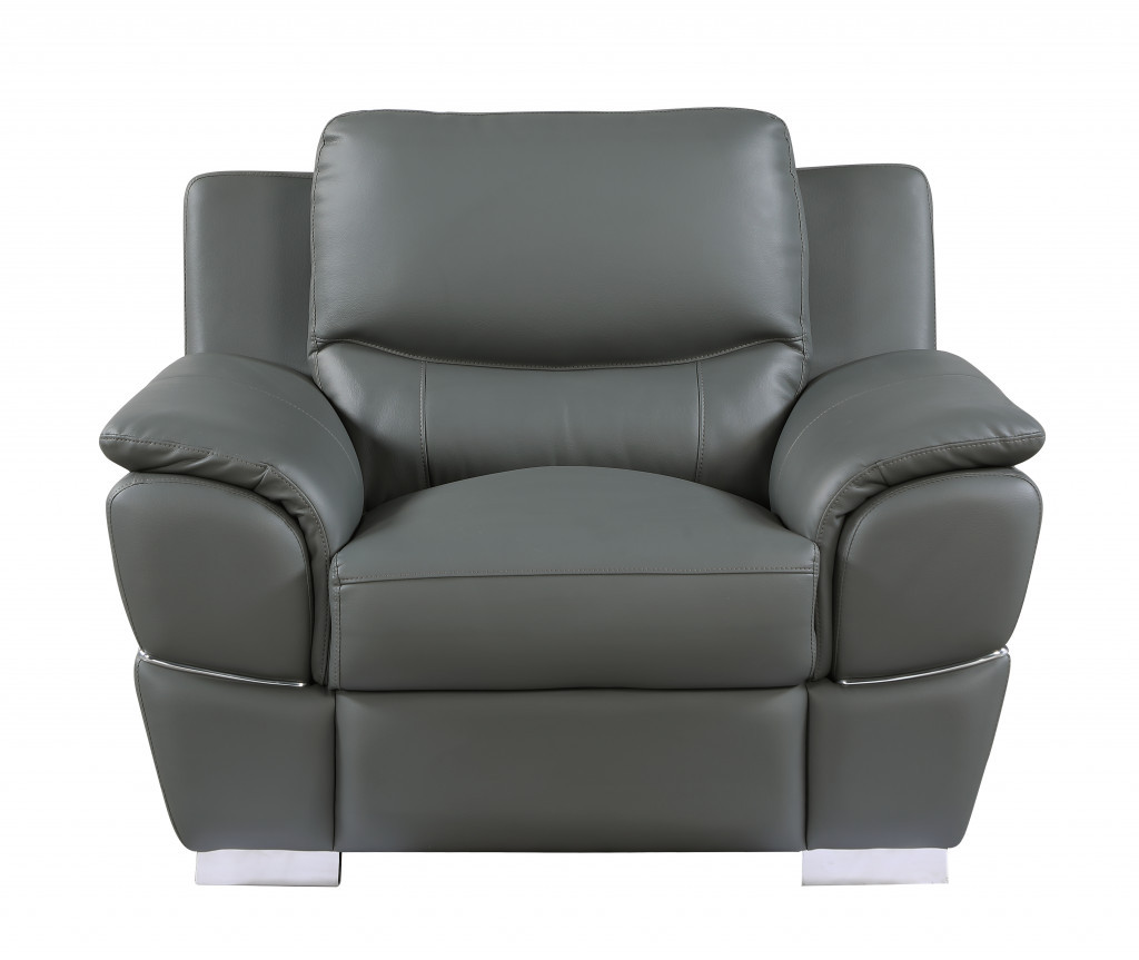 This 48-inch gray and silver leather match club chair is the perfect decorative yet functional accessory for your home. Built to last this club chair is finished in solid gray leather match to give your room a great update. The high quality solid and manufactured wood inner frame flaunts convenient armrests and a tight back that are complimented by soft and comfortable cushioning. 37-inch h x 48-inch w x 37-inch d.