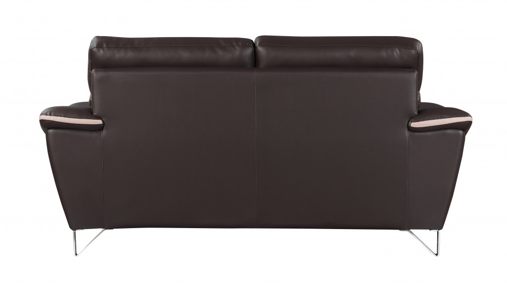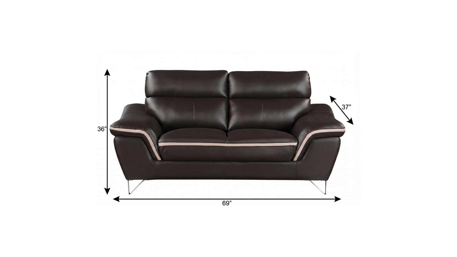 This 69-inch brown and silver faux leather love seat is made from sturdy and resilient faux leather that will look and feel like leather. Pillow top arms offer a comfy place to rest and give this piece some interest and shape. A great showpiece for your room, this sofa is a must have. 36-inch H x 69-inch W x 37-inch D