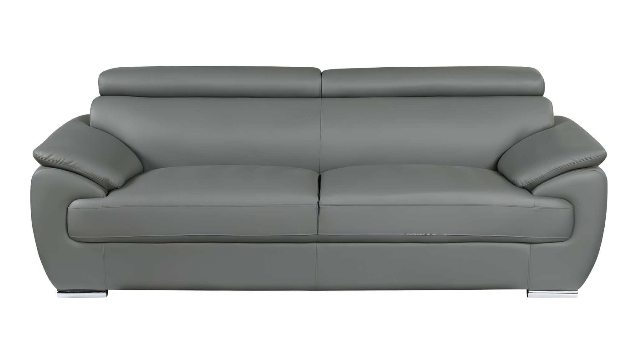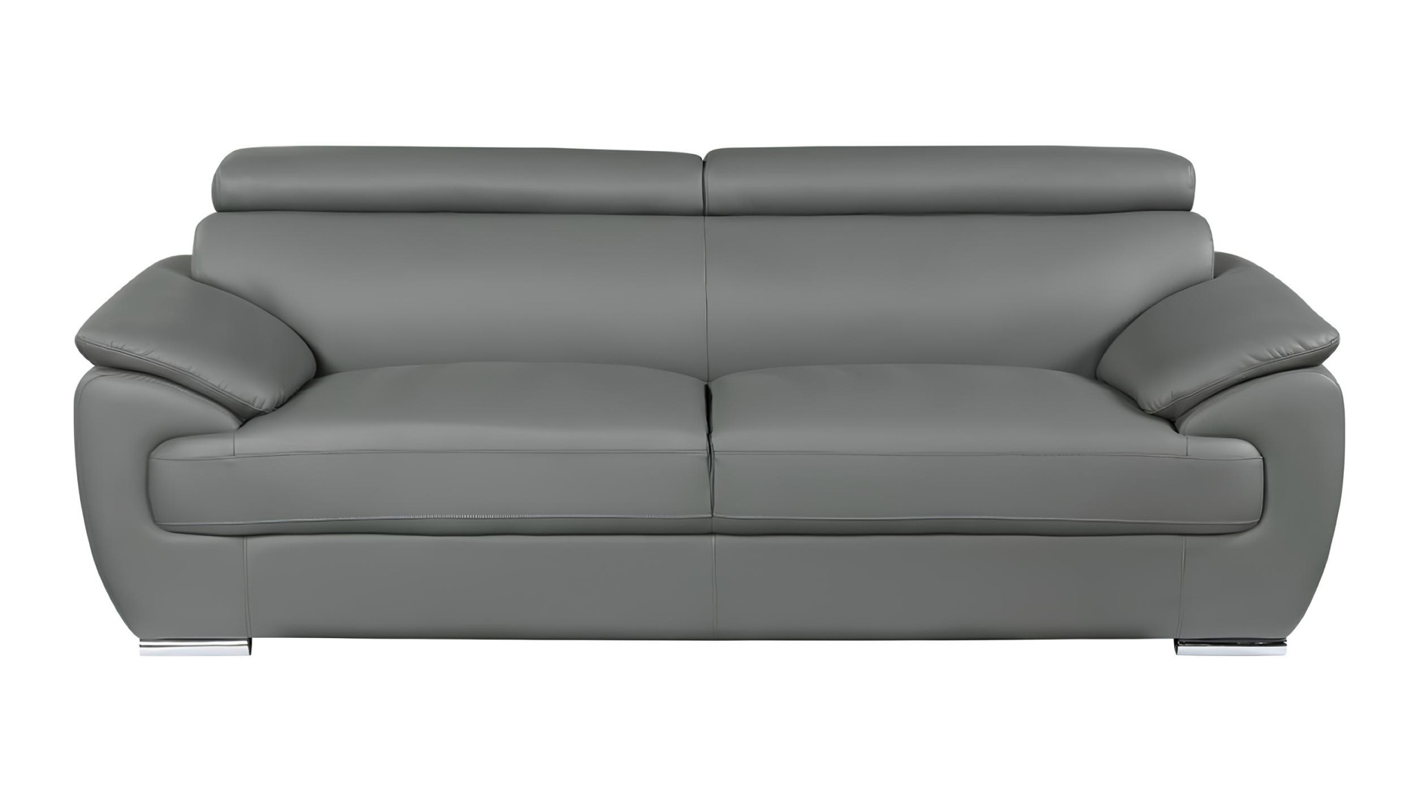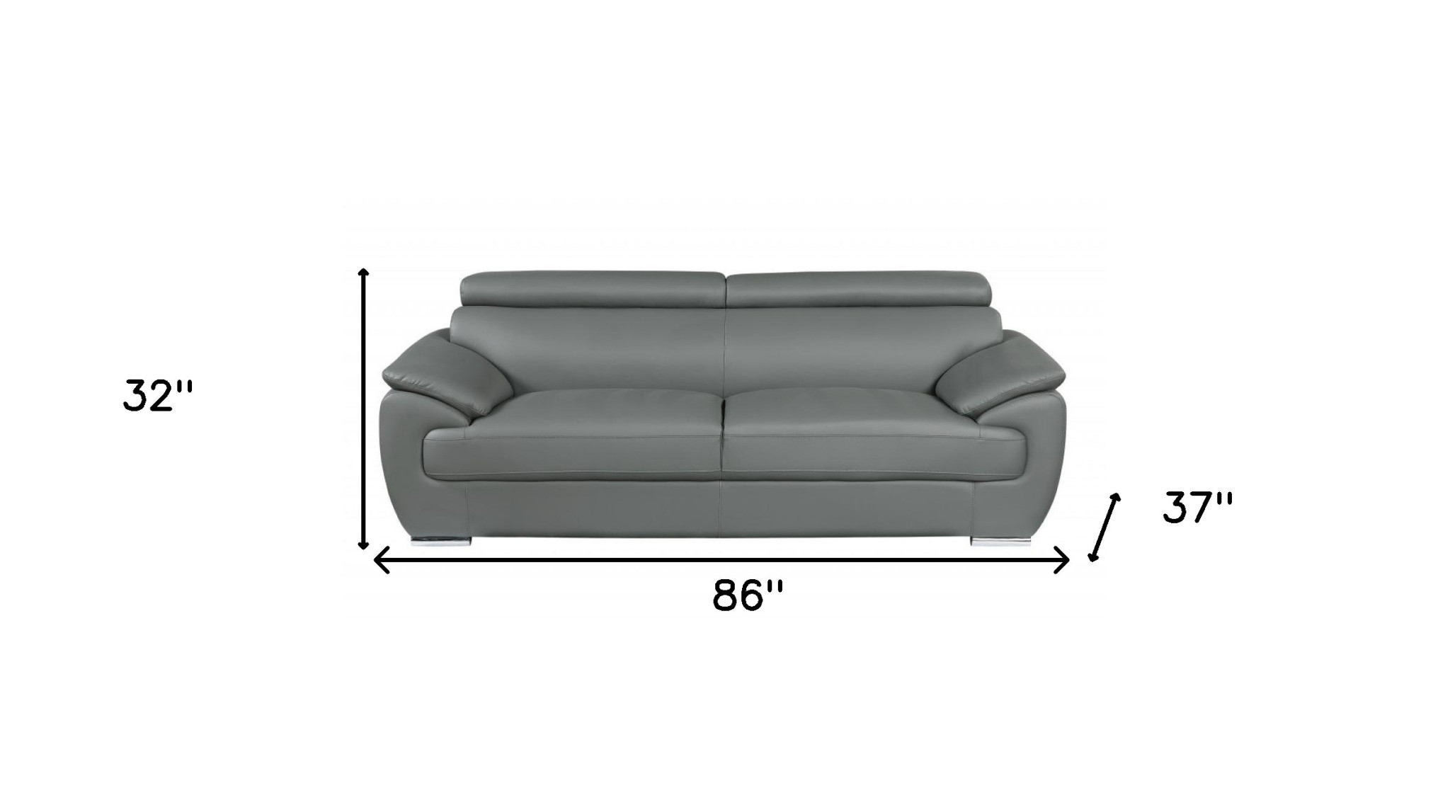 Superior construction from fabulously soft and high grade leather gives this 86-inch gray leather sofa with silver legs a leg up on the competition. The premium leather used makes your lounging luxuriously comfortable and adds an elegant appeal to your space. Solid colors give you lots of decorative options and are easy to work into your decor scheme. Sinuous springs construction gives this piece strong support and makes it comfortable to sit even for long periods of time. Pillow top arms offer a comfy place to rest. Silver stainless steel legs effortlessly elevate the room and add a touch of contemporary design. A great showpiece for your room, this sofa is a must have. 32-inch H x 86-inch W x 37-inch D