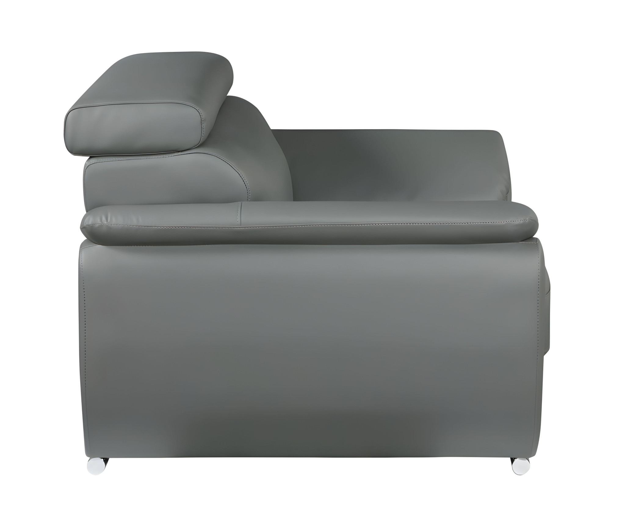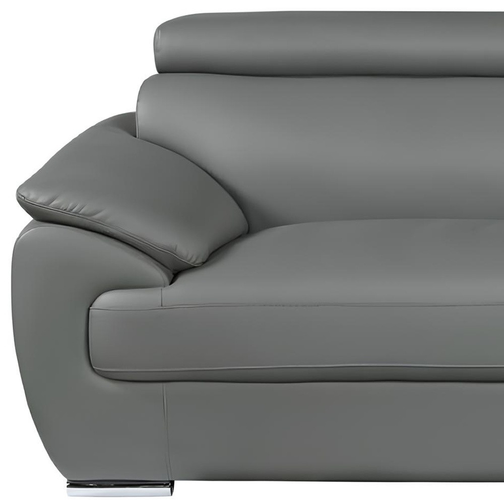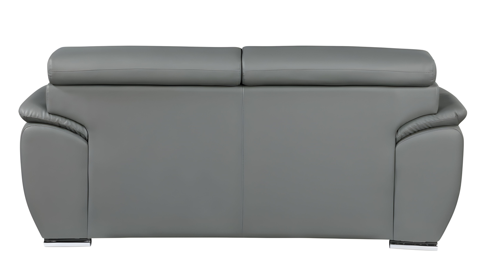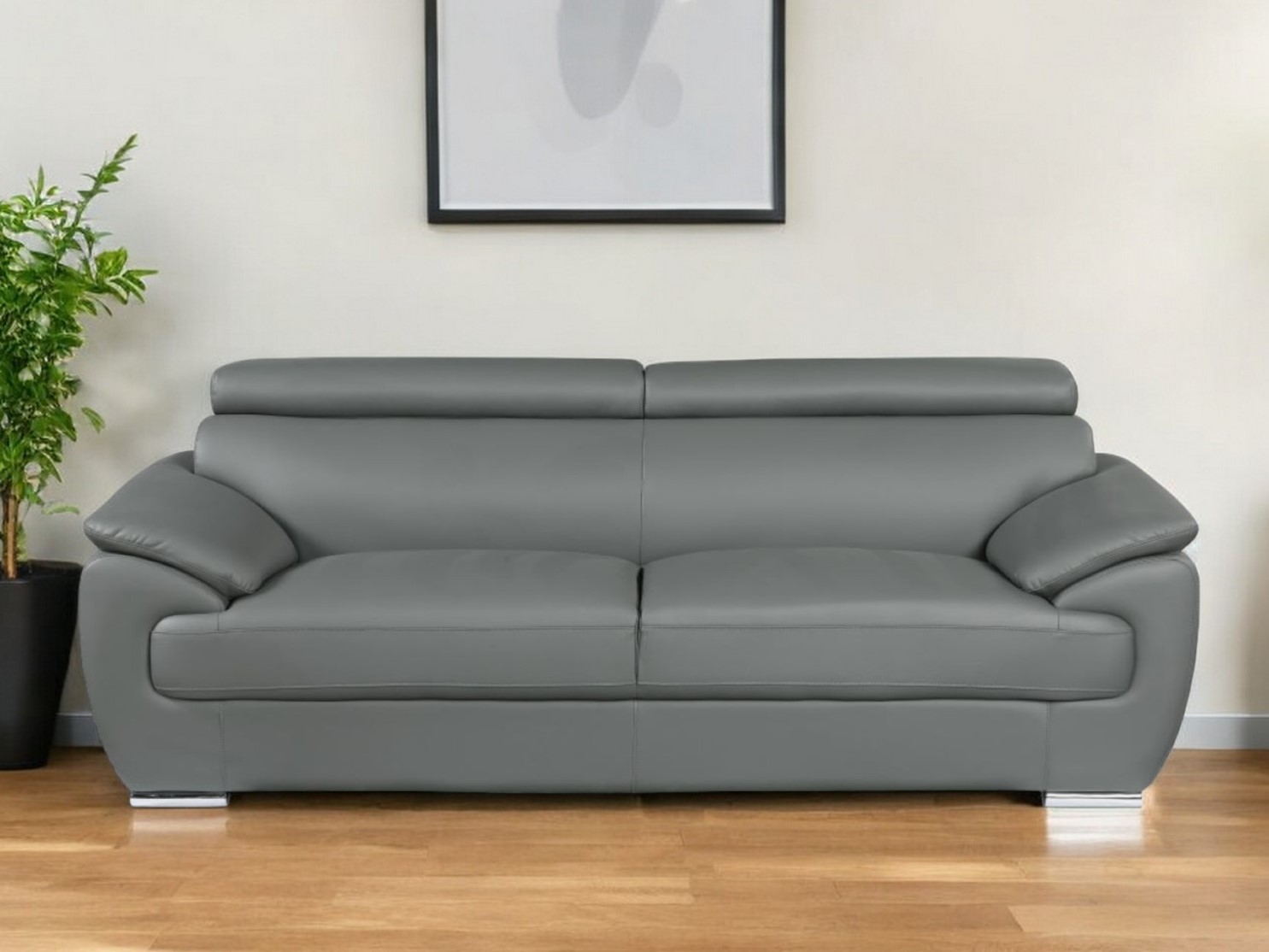 Superior construction from fabulously soft and high grade leather gives this 86-inch gray leather sofa with silver legs a leg up on the competition. The premium leather used makes your lounging luxuriously comfortable and adds an elegant appeal to your space. Solid colors give you lots of decorative options and are easy to work into your decor scheme. Sinuous springs construction gives this piece strong support and makes it comfortable to sit even for long periods of time. Pillow top arms offer a comfy place to rest. Silver stainless steel legs effortlessly elevate the room and add a touch of contemporary design. A great showpiece for your room, this sofa is a must have. 32-inch H x 86-inch W x 37-inch D