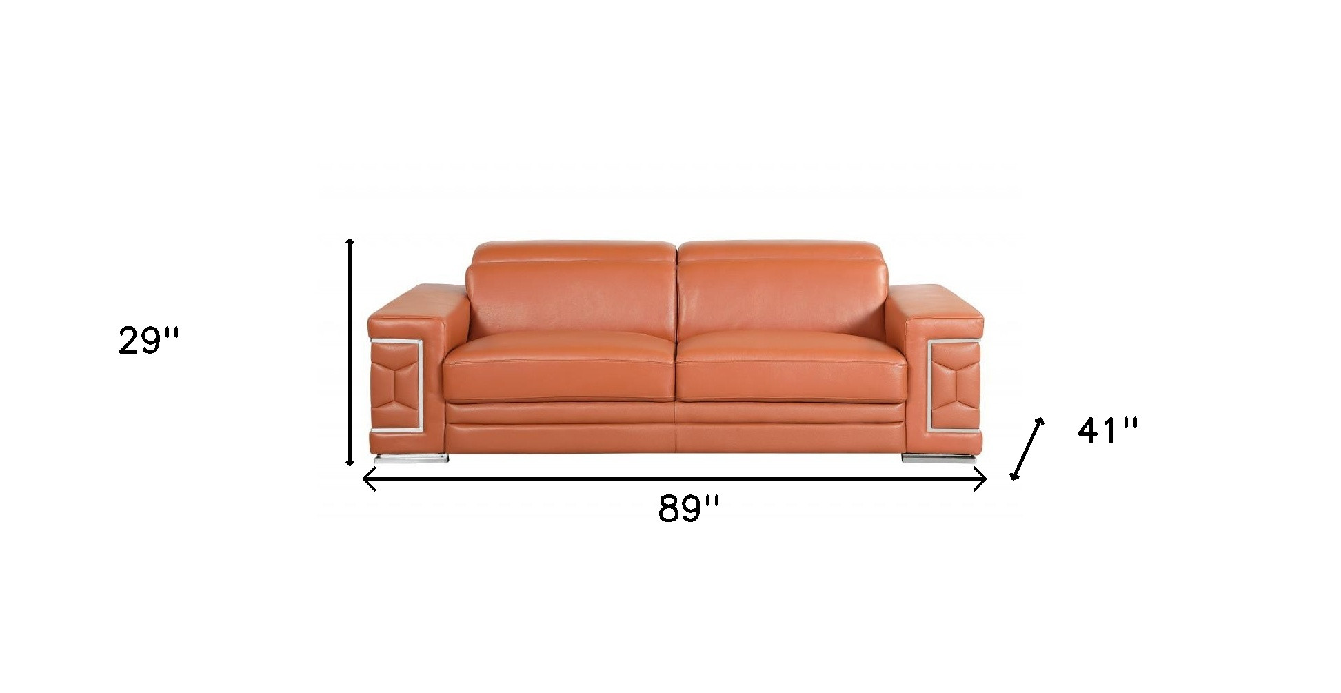 Made of the highest quality, supple leather, this 89-inch camel italian leather sofa with silver legs will be the star of your space. The high grade premium leather used makes your lounging luxuriously comfortable and adds an elegant appeal to your space. Solid colors give you lots of decorative options and are easy to work into your decor scheme. Sinuous springs construction gives this piece strong support and makes it comfortable to sit even for long periods of time. Square arms offer a comfy place to rest. Silver stainless steel legs effortlessly elevate the room and add a touch of contemporary design. Built to last, this sofa will be a great centerpiece for your room. 29-inch H x 89-inch W x 41-inch D