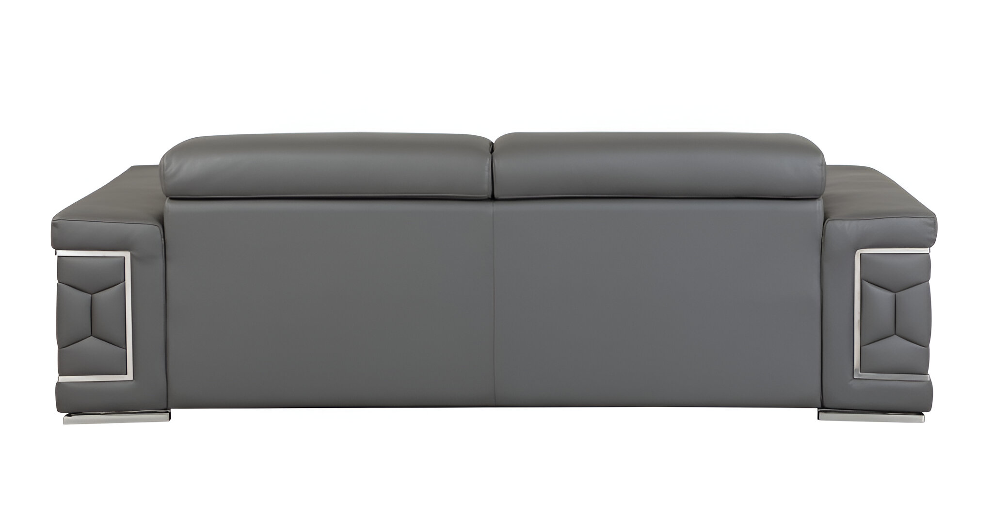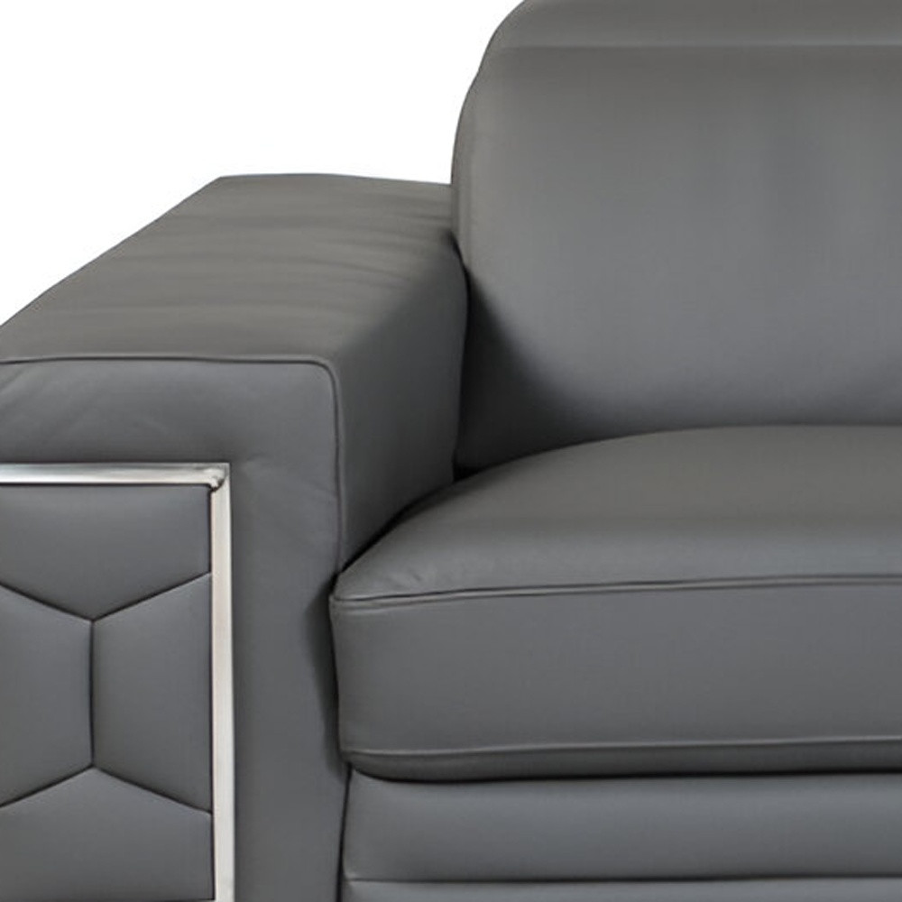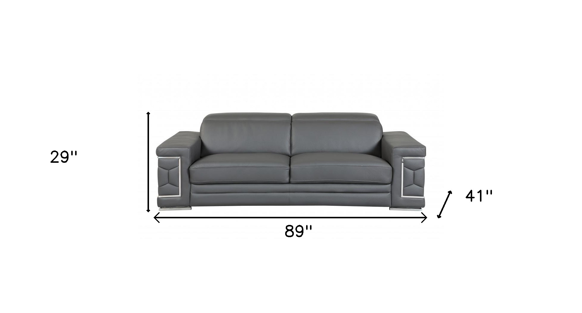 Superior construction from fabulously soft and high grade leather gives this 89-inch dark gray italian leather sofa with silver legs a leg up on the competition. The premium leather used makes your lounging luxuriously comfortable and adds an elegant appeal to your space. Solid colors give you lots of decorative options and are easy to work into your decor scheme. Square arms offer a comfy place to rest. Silver stainless steel legs effortlessly elevate the room and add a touch of contemporary design. A great showpiece for your room, this sofa is a must have. 29-inch H x 89-inch W x 41-inch D