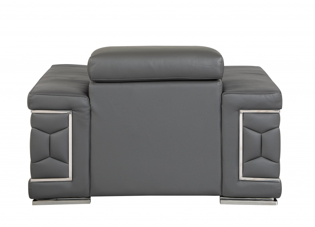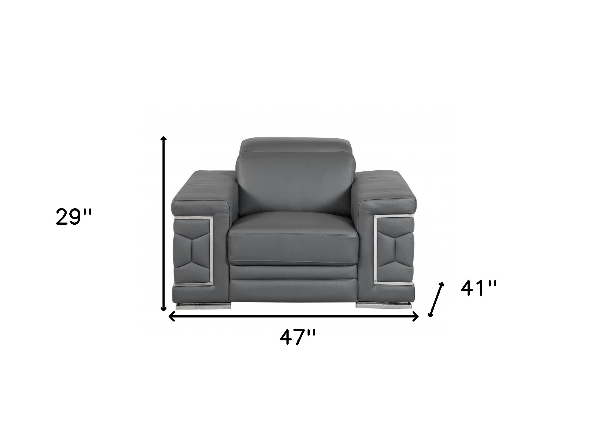 Fill your living room, bedroom, or office with fashionable seating options with this 47-inch dark gray and silver genuine leather arm chair. Built to last this arm chair is finished in solid dark gray genuine leather to give your room a great update. The high quality solid and manufactured wood inner frame flaunts convenient armrests and a tight back that are complimented by soft and comfortable cushioning. 29-inch h x 47-inch w x 41-inch d.