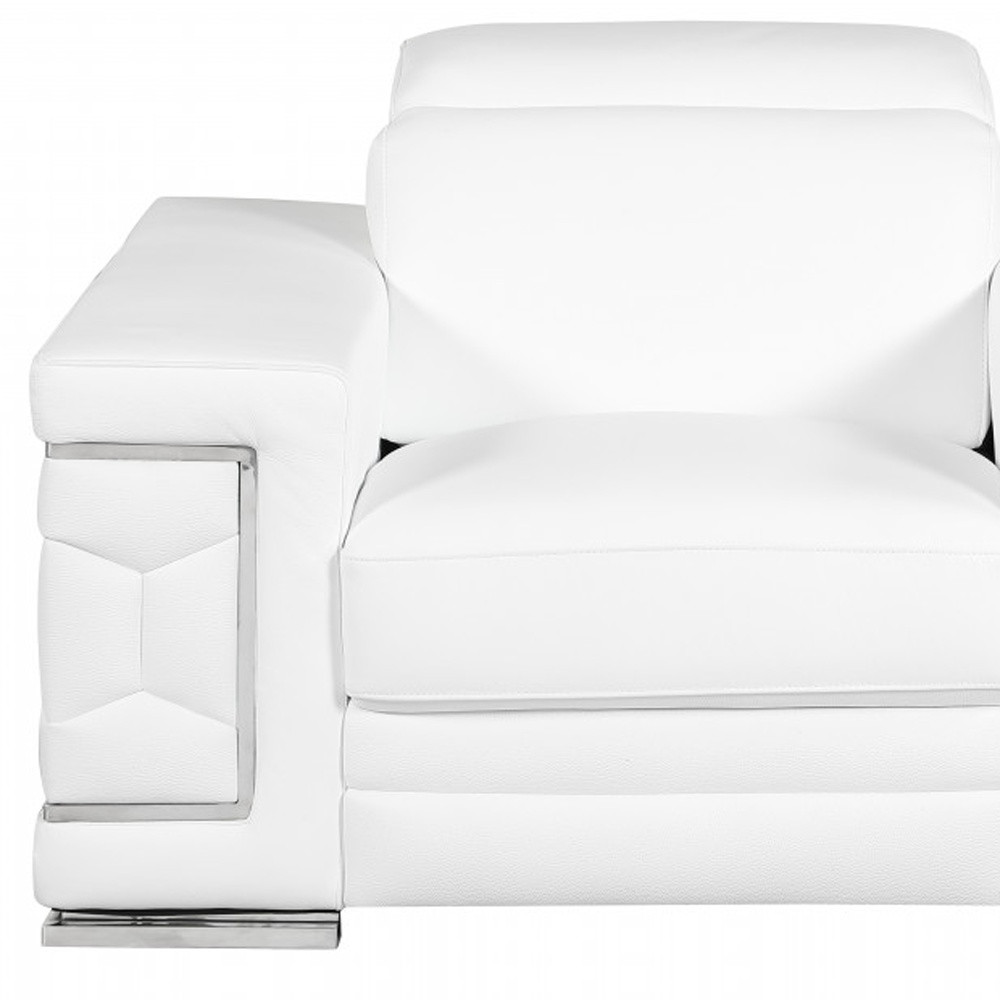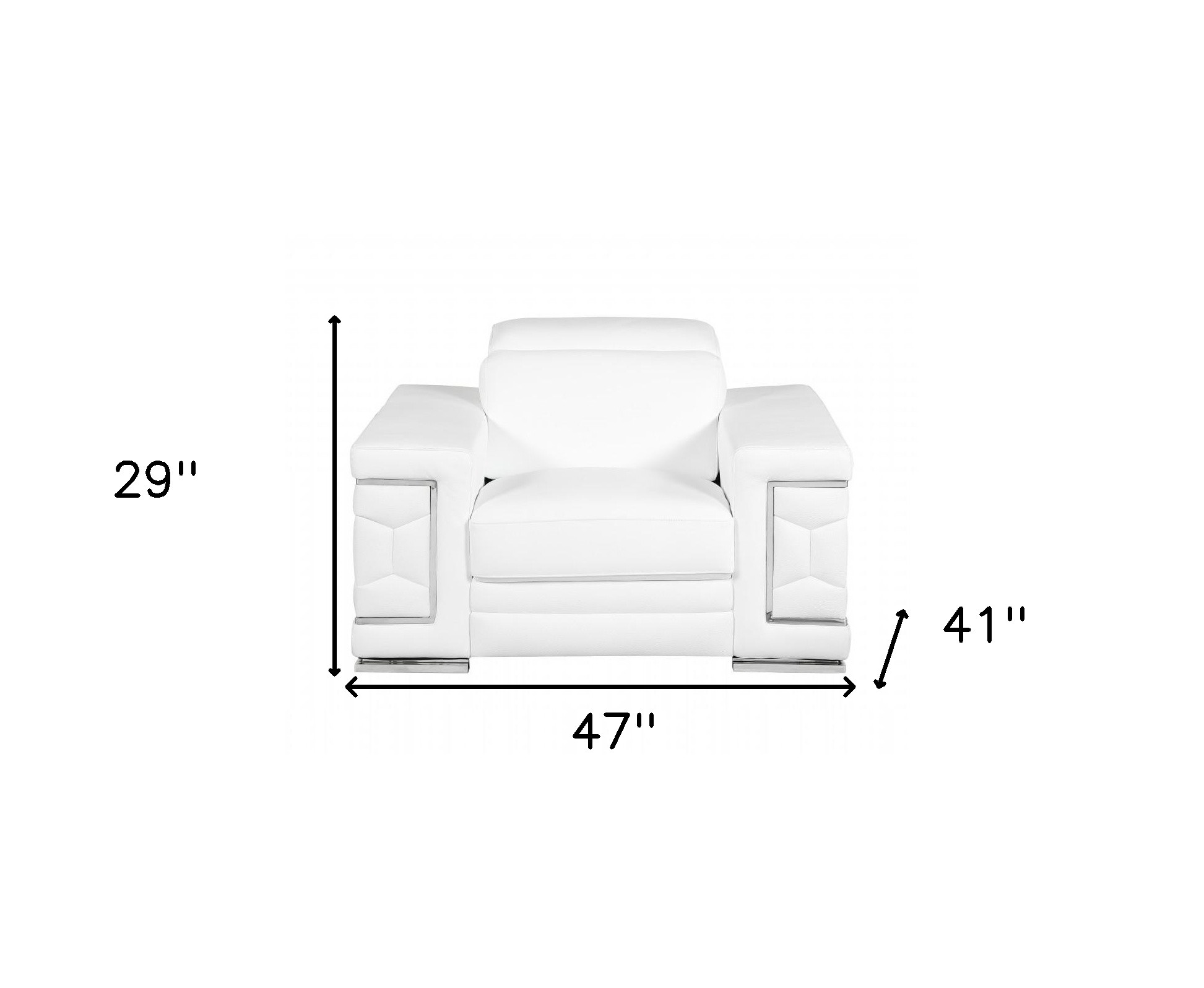 A mix of form and function, this 47-inch white and silver genuine leather arm chair will bring a good looking and usable accent to your space. Built to last this arm chair is finished in solid white genuine leather to give your room a great update. The high quality solid and manufactured wood inner frame flaunts convenient armrests and a tight back that are complimented by soft and comfortable cushioning. 29-inch h x 47-inch w x 41-inch d.