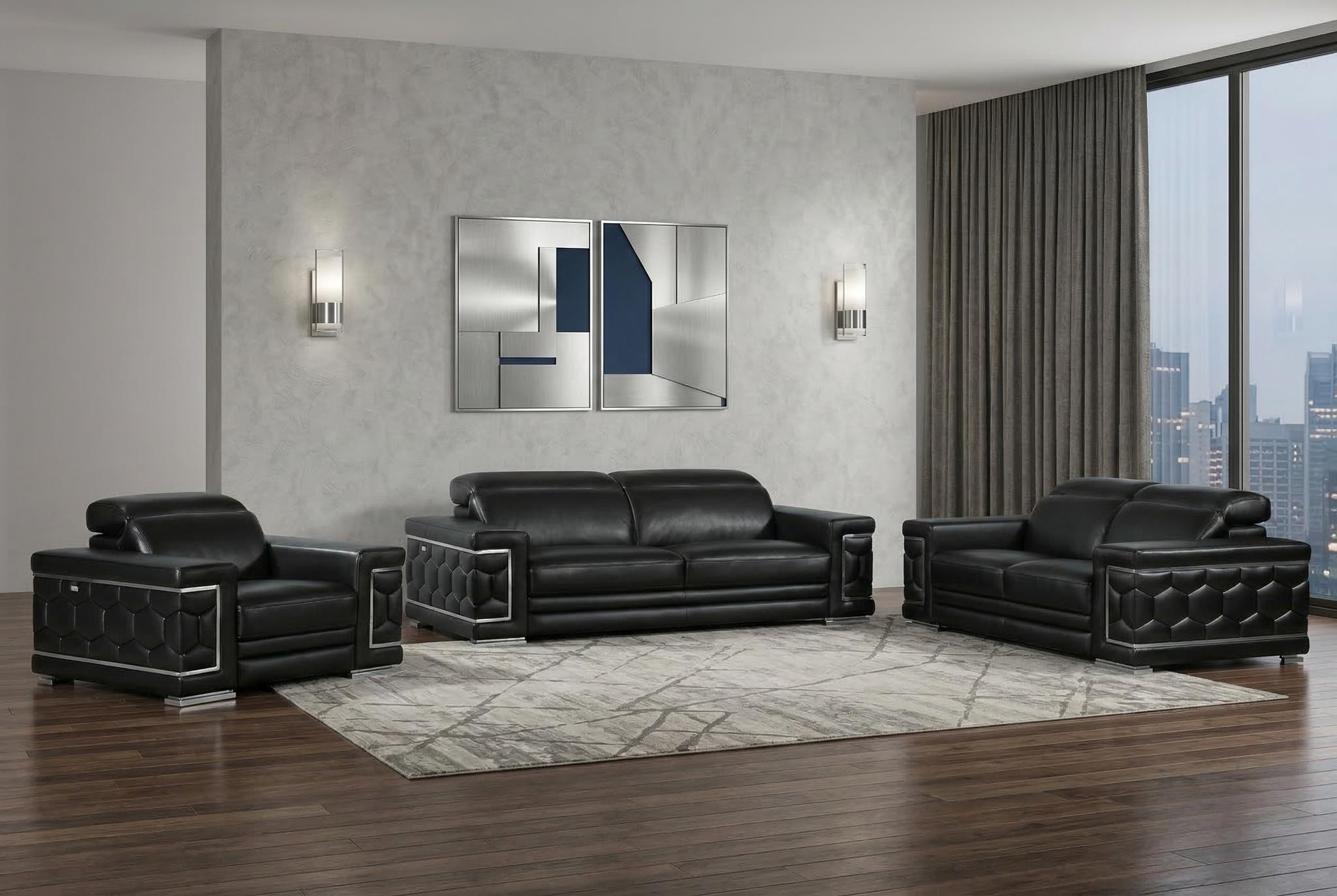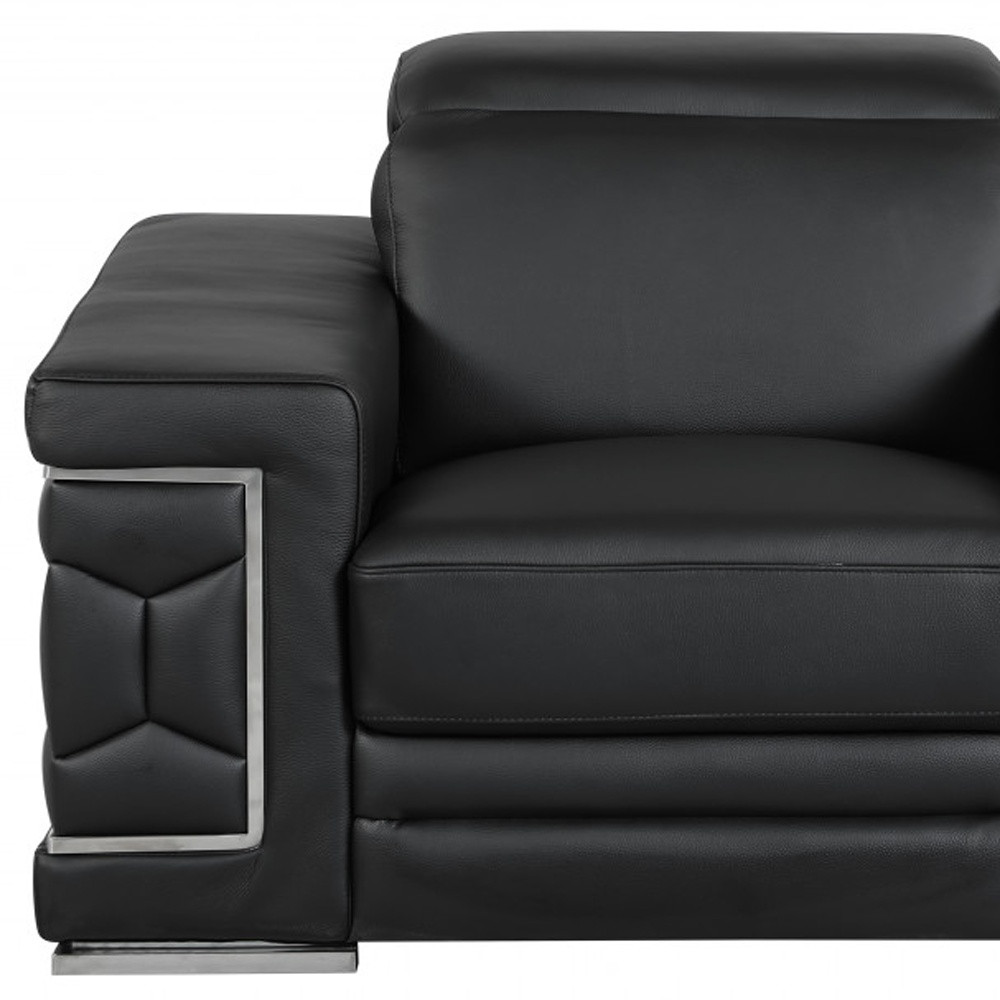 Step into a world of unparalleled seating comfort that is sure to dazzle even the toughest critic with our remarkable three piece indoor black italian leather six person seating set. Upholstered in supple and luxurious genuine leather, this set has a rich and warm appeal. Coil spring seat construction provides excellent comfort by offering a responsive and supportive seating experience, gently contouring to the body's natural curves. The inclusion of a loveseat into your mix allows a fashionable seating option in a compact design. Ready to re-decorate. This set is an obvious choice to fill your space with style and class. 29-inch H x 225-inch W x 41-inch D