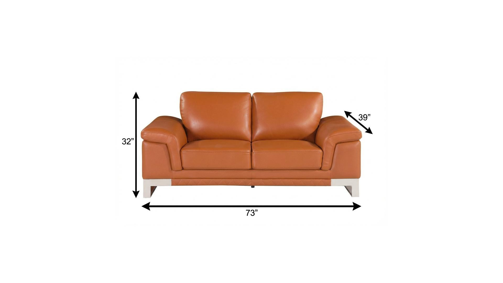 Made of top quality, supple leather, this 73-inch camel and silver genuine leather loveseat will be the star of your space. The high grade premium leather used makes your lounging luxuriously comfortable and adds an elegant appeal to your space. Pillow top arms offer a comfy place to rest and give this piece some interest and shape. A great showpiece for your room, this sofa is a must have. 32-inch H x 73-inch W x 39-inch D