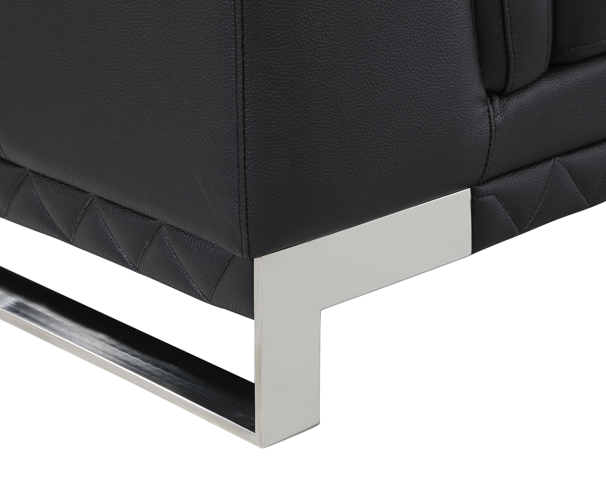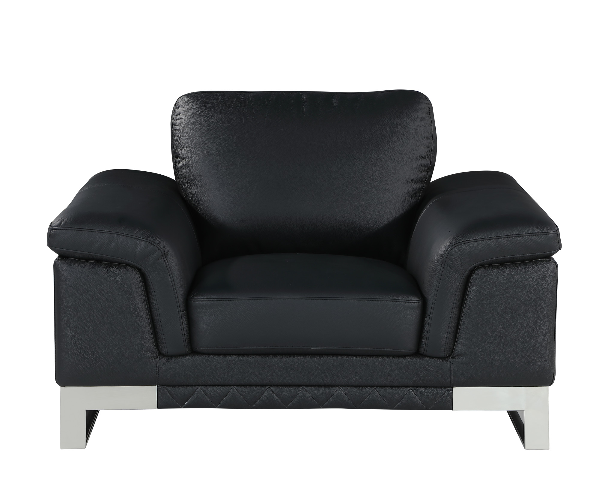 This 49-inch black and silver genuine leather arm chair is the perfect decorative yet functional accessory for your home. This gorgeous solid color black arm chair is masterfully upholstered in durable genuine leather. The high quality solid and manufactured wood inner frame flaunts convenient armrests and a tight back that are complimented by soft and comfortable cushioning. 32-inch h x 49-inch w x 39-inch d.