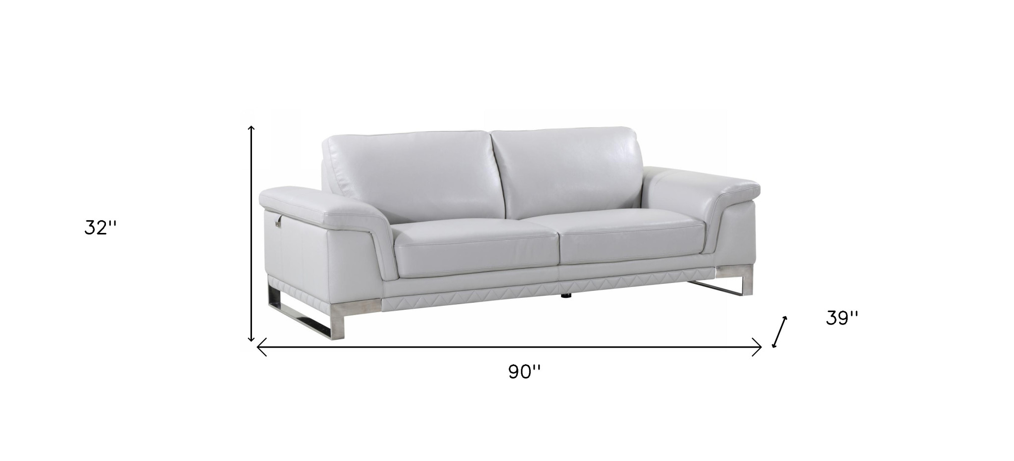 An interior designer's dream, this buttery soft high grade leather 90-inch light gray italian leather sofa with silver legs will bring just the right touch to your space. The premium leather used makes your lounging luxuriously comfortable and adds an elegant appeal to your space. Solid colors give you lots of decorative options and are easy to work into your decor scheme. Sinuous springs construction gives this piece strong support and makes it comfortable to sit even for long periods of time. Pillow top arms offer a comfy place to rest. Silver stainless steel legs effortlessly elevate the room and add a touch of contemporary design. Built to last, this sofa will be a great centerpiece for your room. 32-inch H x 90-inch W x 39-inch D