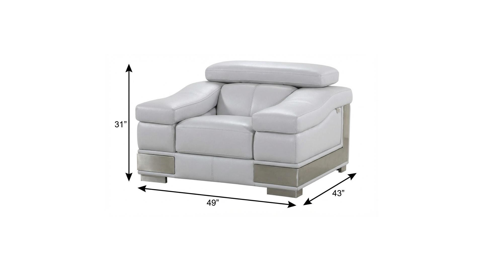 Unique and decorative, this 49-inch gray genuine leather arm chair will leave a lasting impression. This sturdy genuine leather upholstered arm chair comes in a chic solid gray color to give your space just the right look. The high quality solid and manufactured wood inner frame flaunts convenient armrests and a tight back that are complimented by soft and comfortable cushioning. 31-inch h x 49-inch w x 43-inch d.