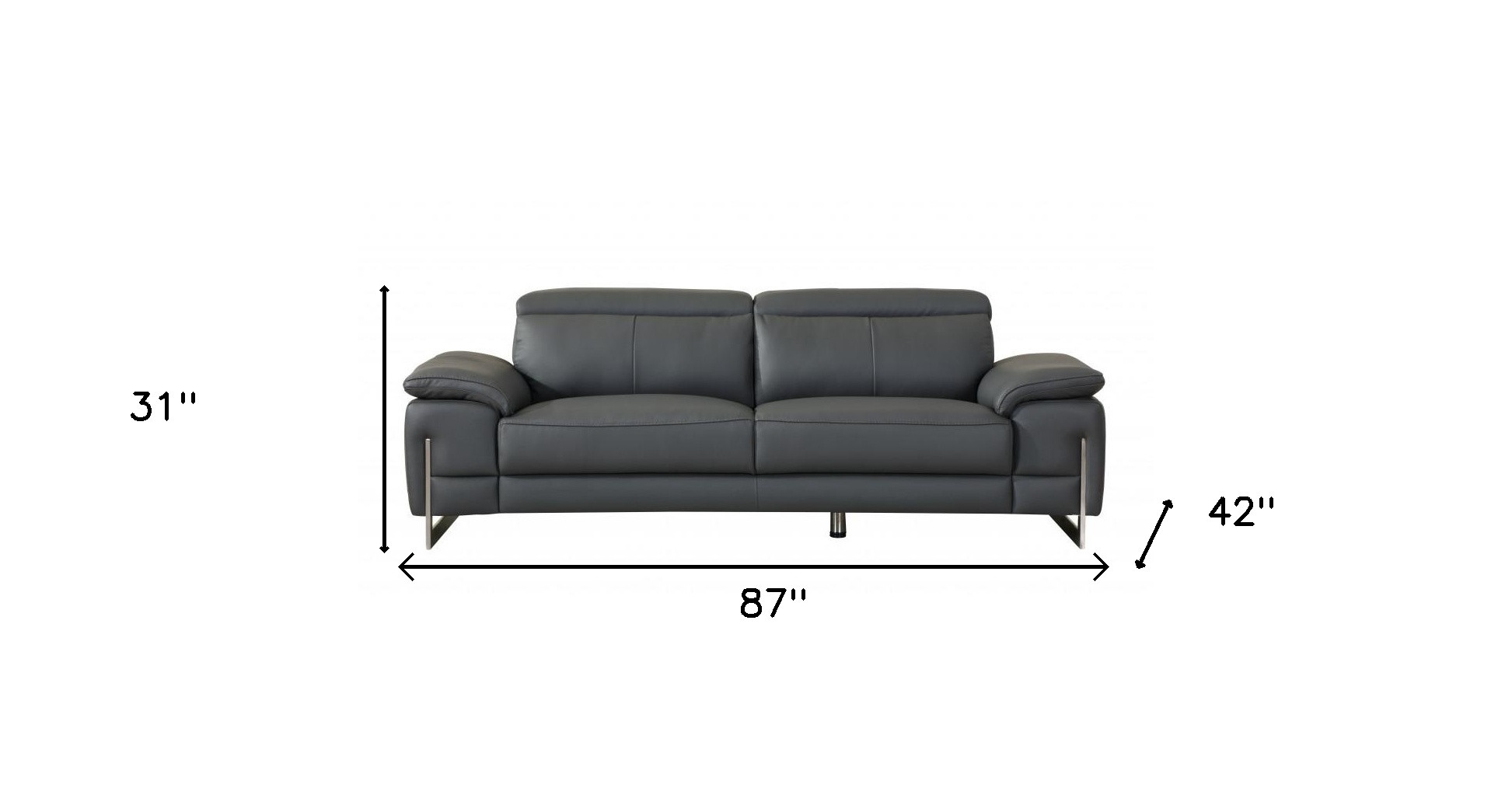 Made of the highest quality, supple leather, this 87-inch dark gray italian leather sofa with silver legs will be the star of your space. The high grade premium leather used makes your lounging luxuriously comfortable and adds an elegant appeal to your space. Solid colors give you lots of decorative options and are easy to work into your decor scheme. Sinuous springs construction gives this piece strong support and makes it comfortable to sit even for long periods of time. Pillow top arms offer a comfy place to rest. Silver stainless steel legs effortlessly elevate the room and add a touch of contemporary design. A great showpiece for your room, this sofa is a must have. 31-inch H x 87-inch W x 42-inch D