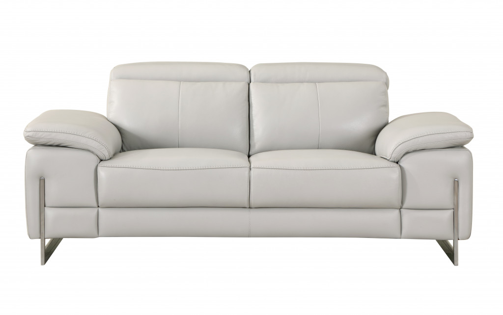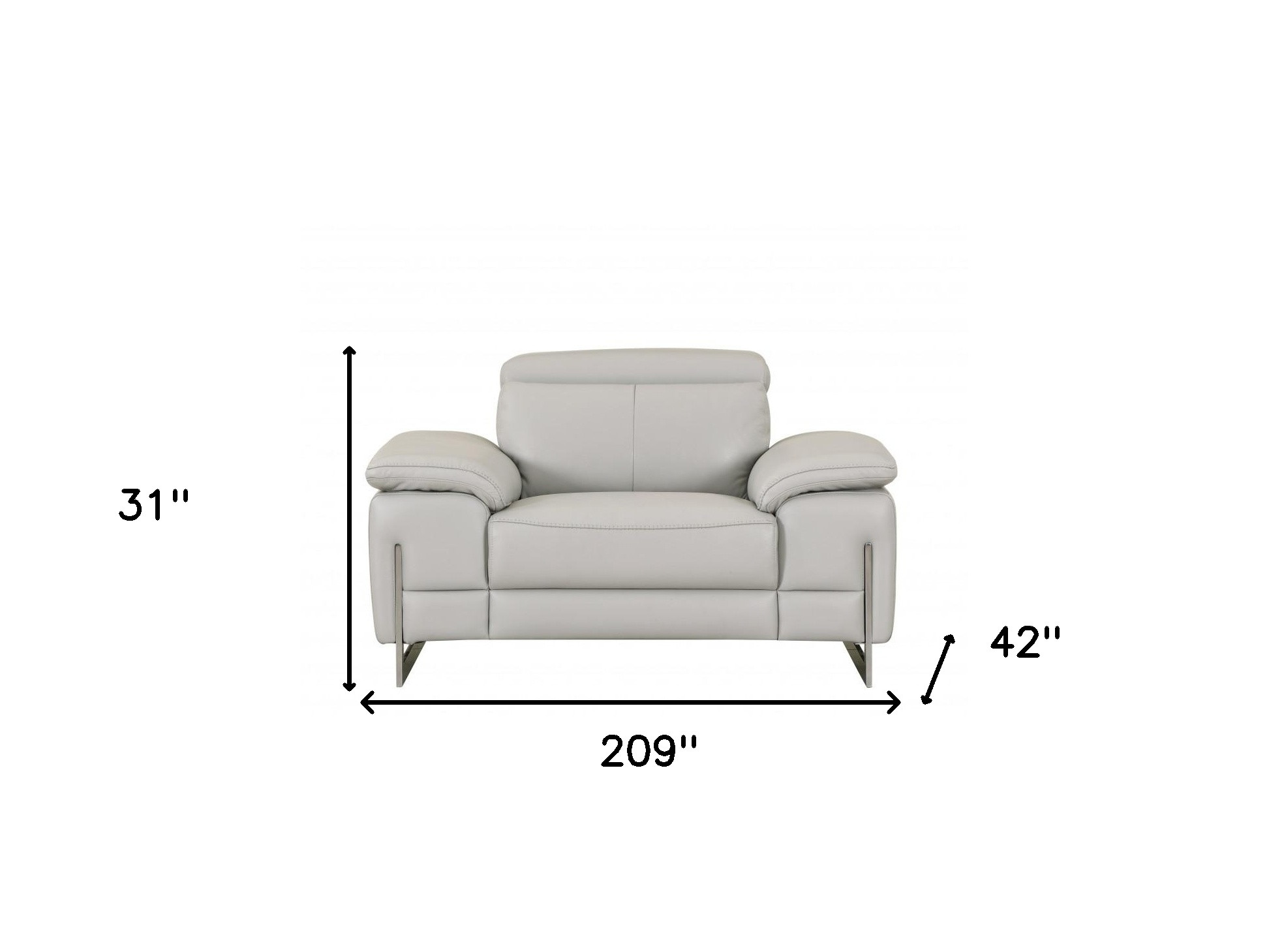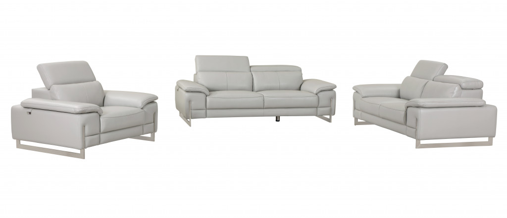 When it comes to indoor seating, this three piece indoor light gray italian leather six person seating set has everything you need to get set and ready to relax. Upholstered in supple and luxurious genuine leather, this set has a rich and warm appeal. The inclusion of a loveseat into your mix allows a fashionable seating option in a compact design. Gather with family and loved ones with this seating set that will bring you all together. 31-inch H x 209-inch W x 42-inch D