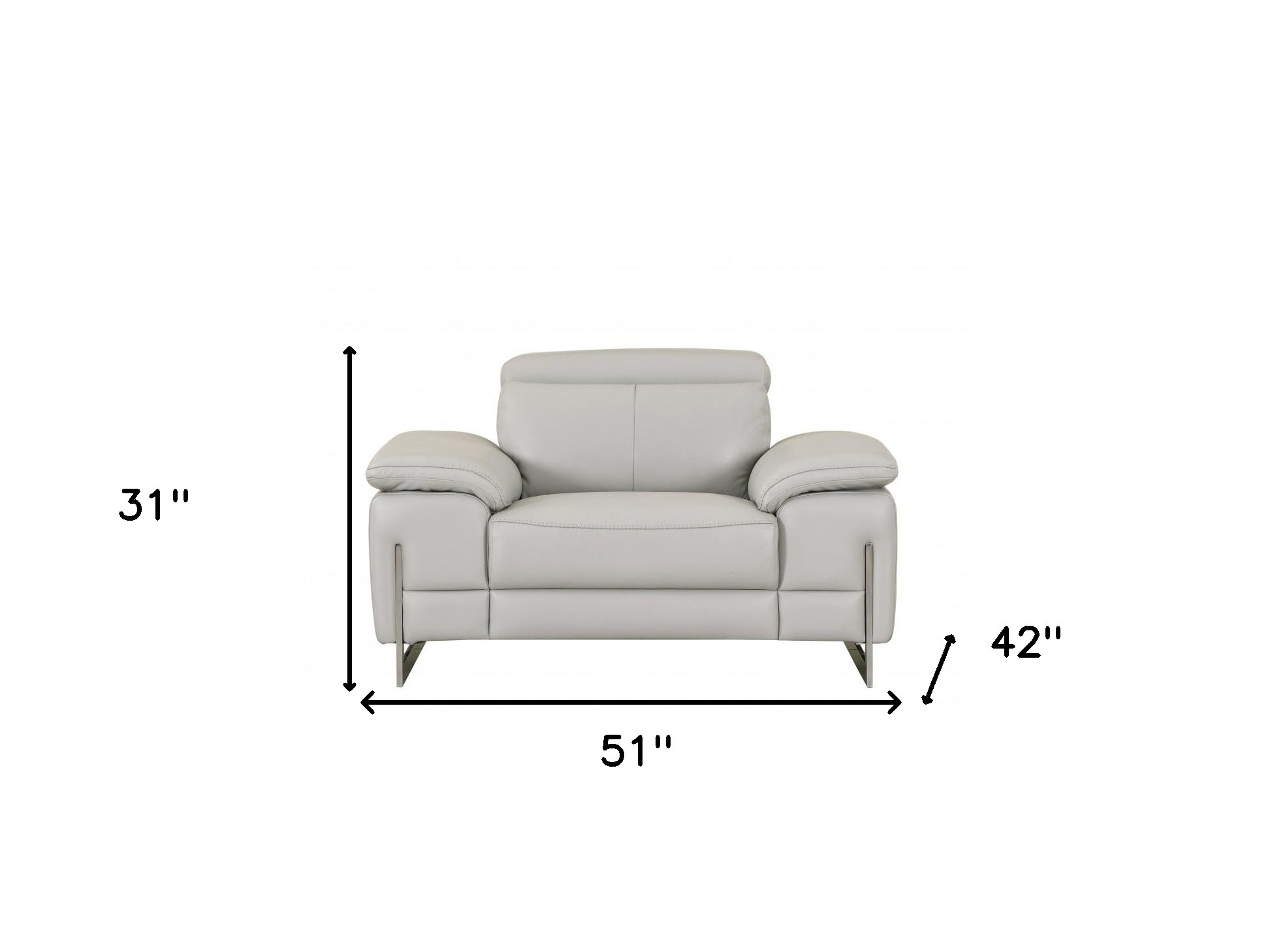 This 51-inch gray and silver genuine leather chair and a half will add a beautiful decorative accent to your decor. Built to last this chair and a half is finished in solid gray genuine leather to give your room a great update. Giving the chair stability and structure, the inner frame is constructed with high quality solid and manufactured wood, includes comfy armrests, and features a tight back that comes complete with soft and comfortable cushioning. 31-inch h x 51-inch w x 42-inch d.