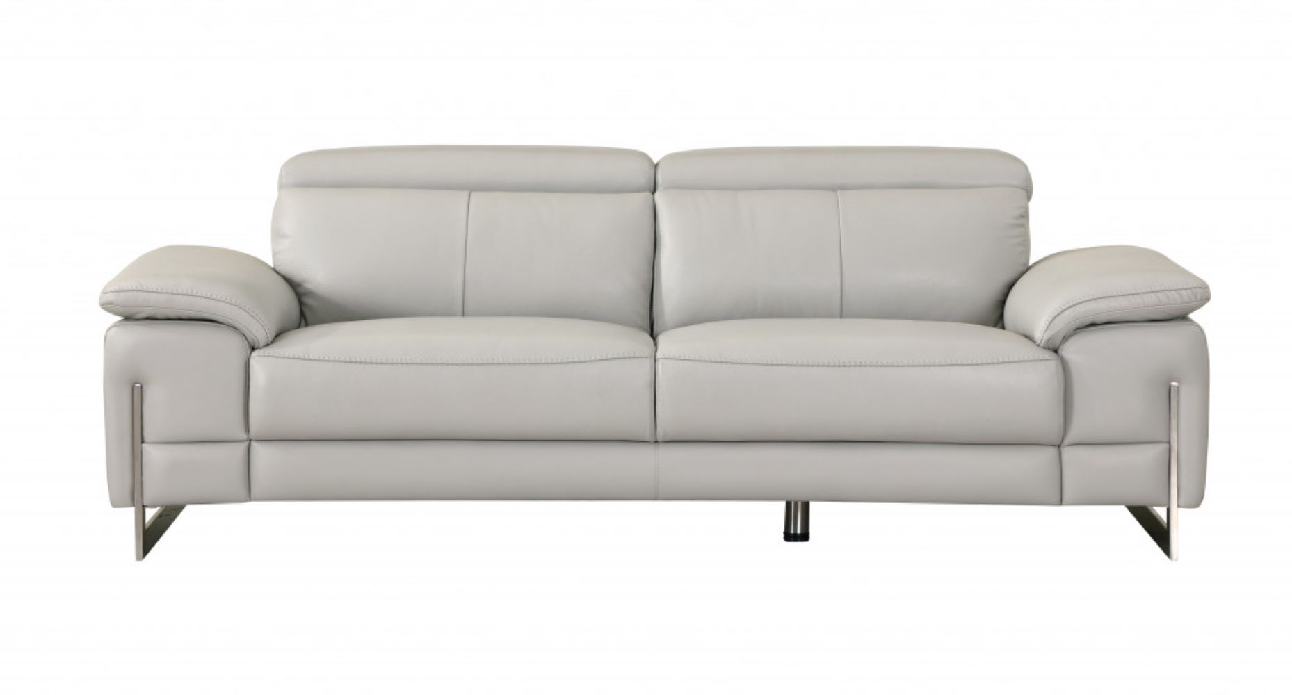 Superior construction from fabulously soft and high grade leather gives this 87-inch light gray italian leather sofa with silver legs a leg up on the competition. The premium leather used makes your lounging luxuriously comfortable and adds an elegant appeal to your space. Solid colors give you lots of decorative options and are easy to work into your decor scheme. Sinuous springs construction gives this piece strong support and makes it comfortable to sit even for long periods of time. Pillow top arms offer a comfy place to rest. Silver stainless steel legs effortlessly elevate the room and add a touch of contemporary design. Built to last, this sofa will be a great centerpiece for your room. 31-inch H x 87-inch W x 42-inch D