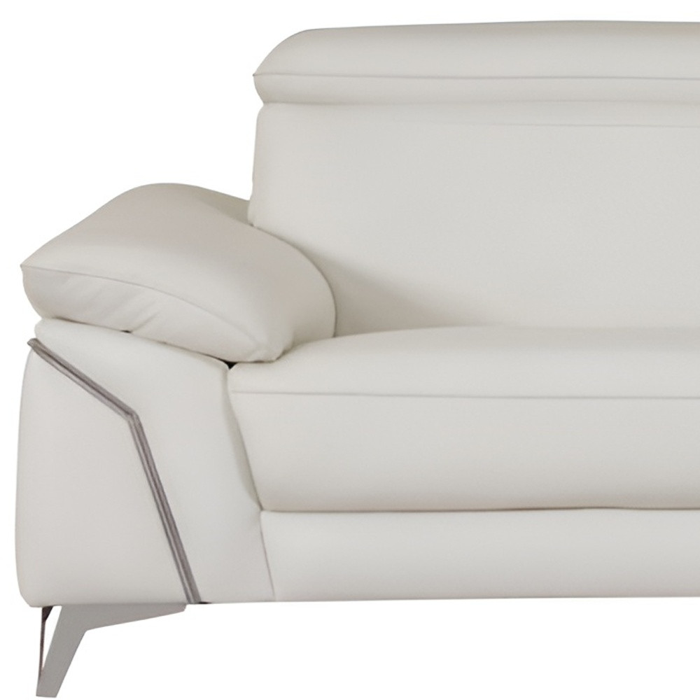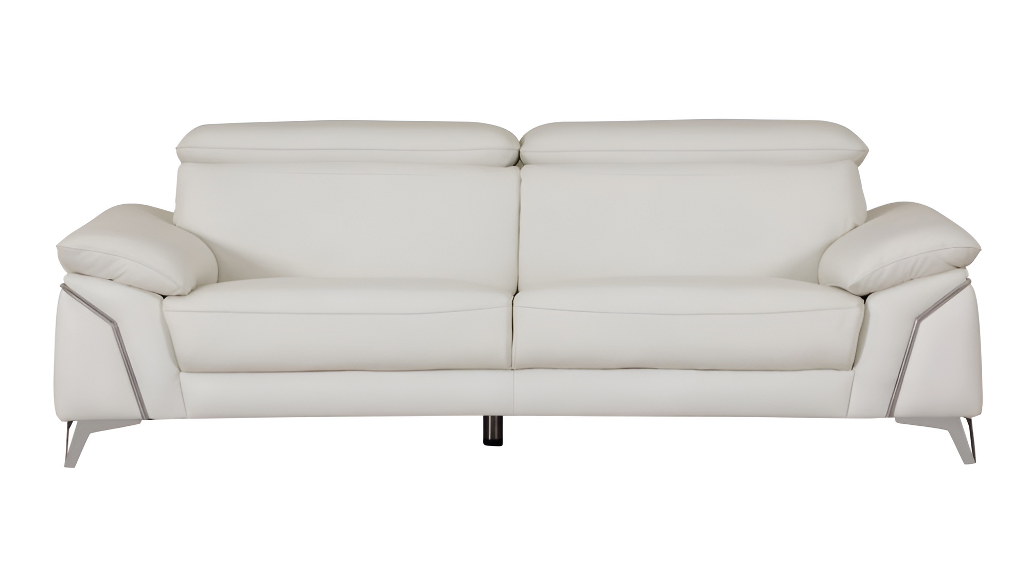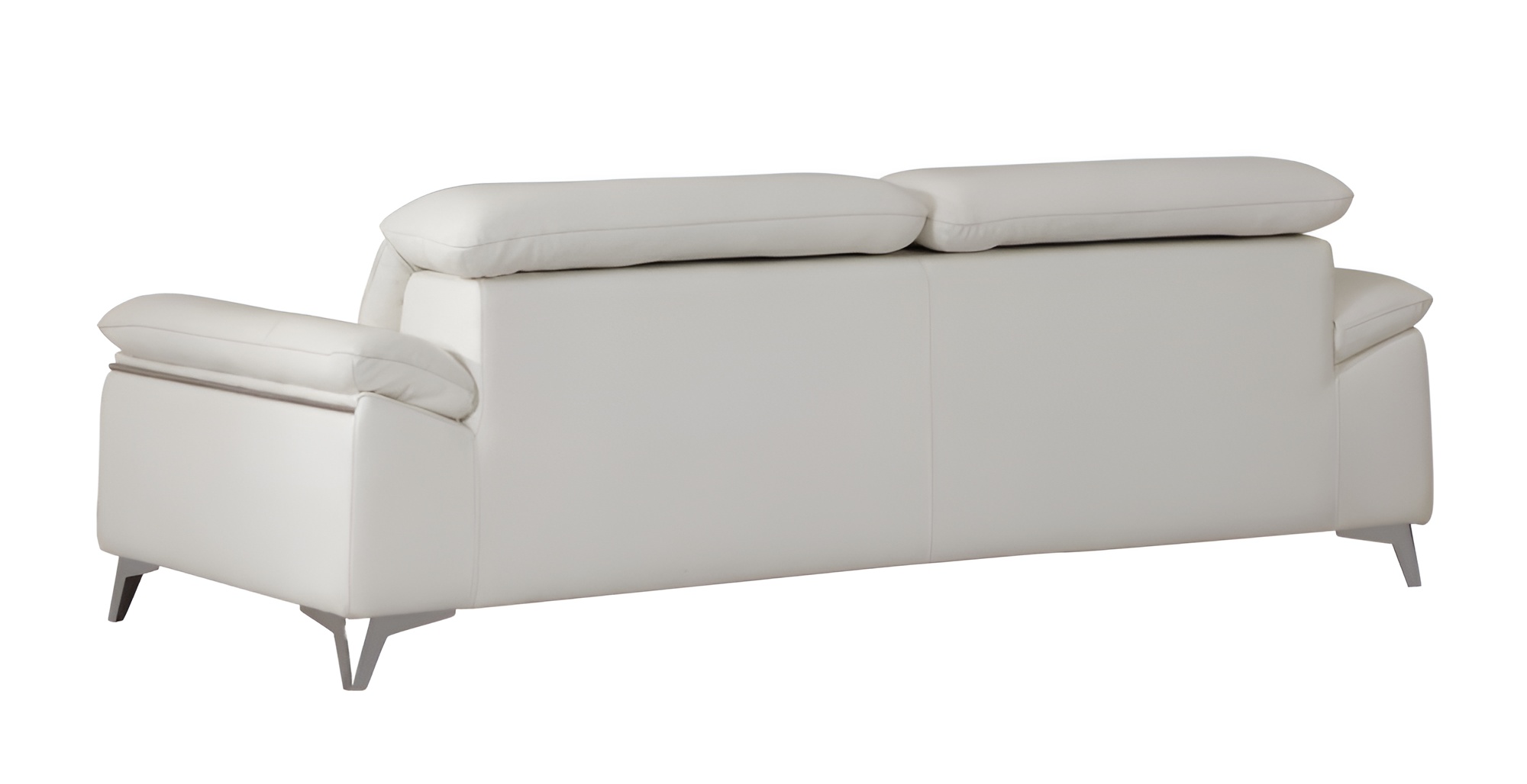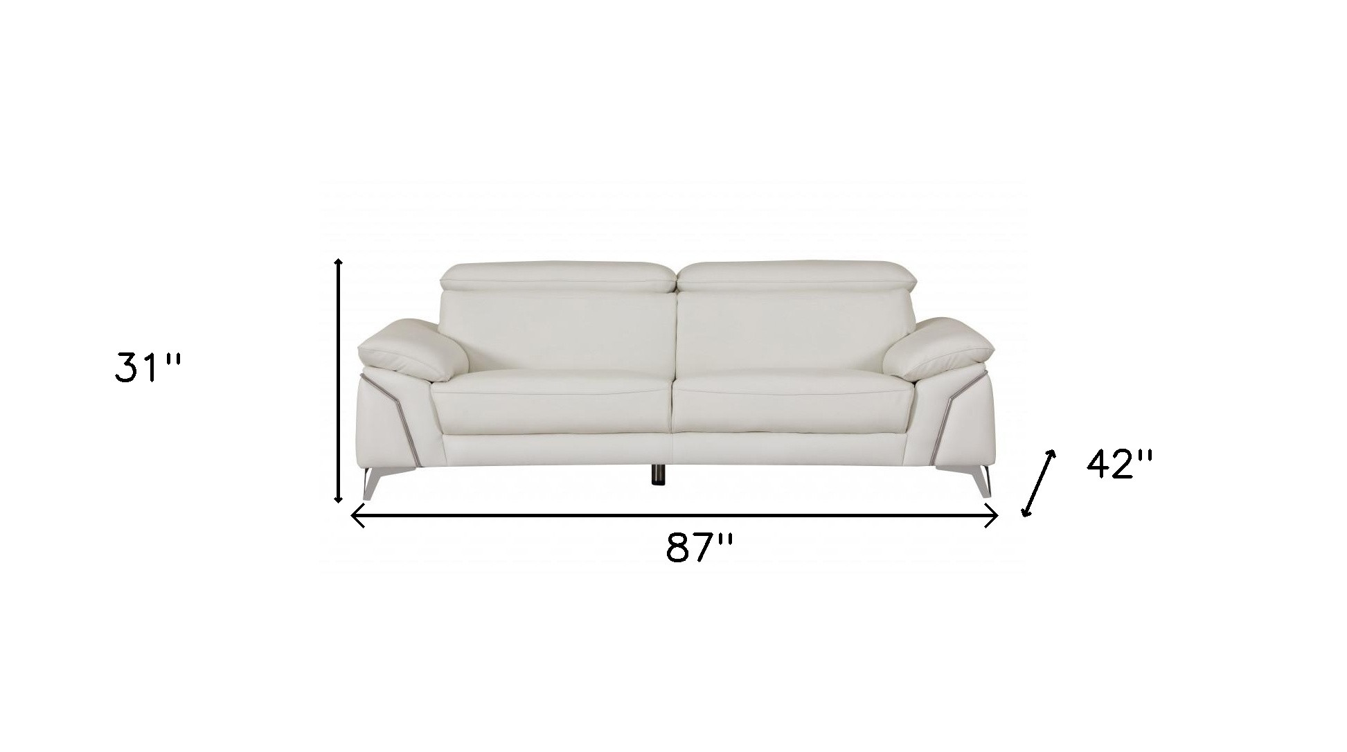 Made of the highest quality, supple leather, this 87-inch white italian leather sofa with silver legs will be the star of your space. The high grade premium leather used makes your lounging luxuriously comfortable and adds an elegant appeal to your space. Solid colors give you lots of decorative options and are easy to work into your decor scheme. Sinuous springs construction gives this piece strong support and makes it comfortable to sit even for long periods of time. Pillow top arms offer a comfy place to rest. Silver stainless steel legs effortlessly elevate the room and add a touch of contemporary design. Built to last, this sofa will be a great centerpiece for your room. 31-inch H x 87-inch W x 42-inch D