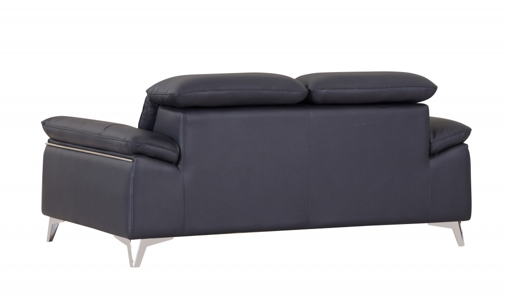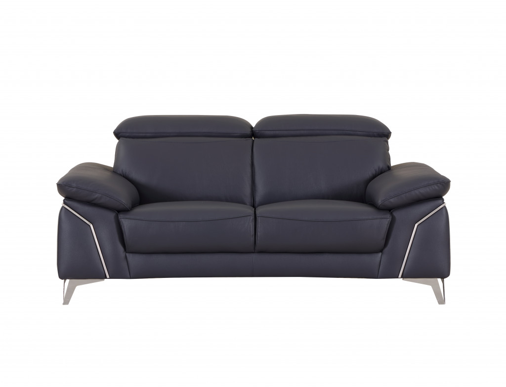 Made of top quality, supple leather, this 71-inch navy blue and silver genuine leather loveseat will be the star of your space. The high grade premium leather used makes your lounging luxuriously comfortable and adds an elegant appeal to your space. Pillow top arms offer a comfy place to rest and give this piece some interest and shape. A great showpiece for your room, this sofa is a must have. 31-inch H x 71-inch W x 42-inch D