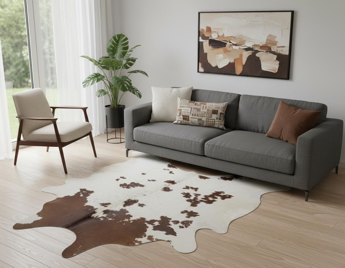 Set an inviting tone in your space with this 6-foot x 7-foot brown and white cowhide area rug. Crafted from cowhide fibers that give this piece premium texture, refinement, and appeal. Rugs are a great way to showcase your style, hide imperfections, warm your home and reduce noise. This larger sized, modern styled rug is ready to create a focal point or statement piece in your room. 72-inch h x 84-inch w x 0.25-inch d.