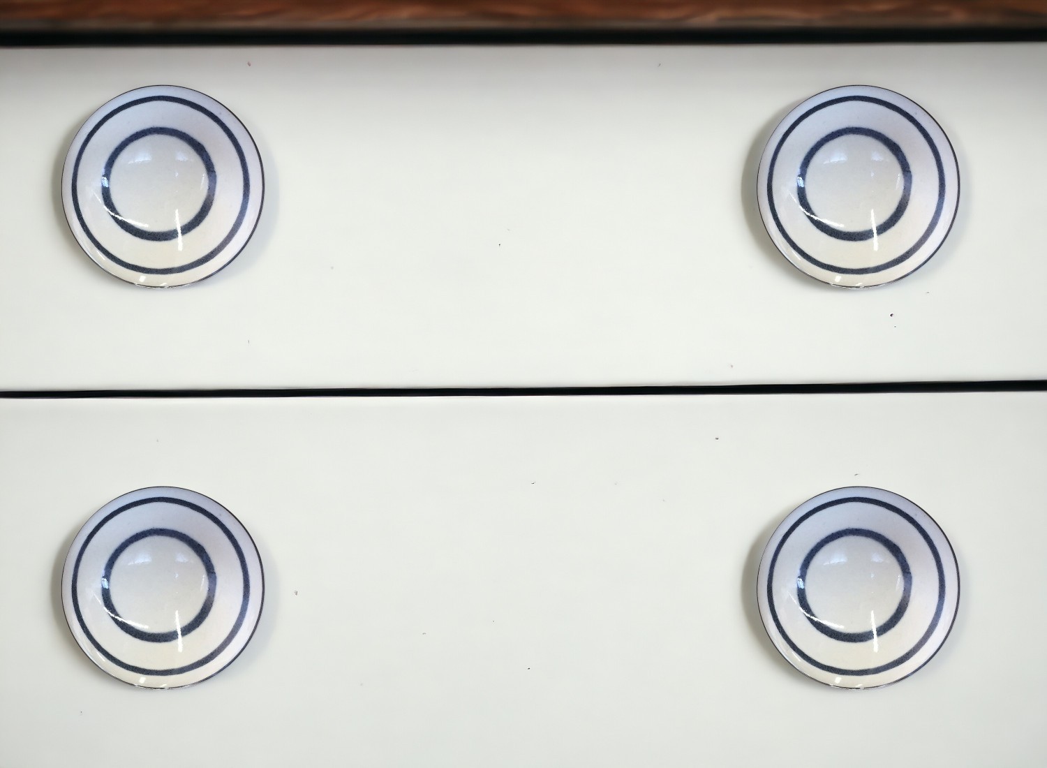 Upgrade your space with a high end look with this set of eight white and navy blue geo lines ceramic drawer pull knobs. Improve the look of your old boring or builder grade furniture and cabinetry with these high quality round knob traditional style knobs. Hand-painted by talented artisans, these knobs will add a touch of artisanal design. 1.5-inch h x 1.5-inch w x 1.5-inch d.