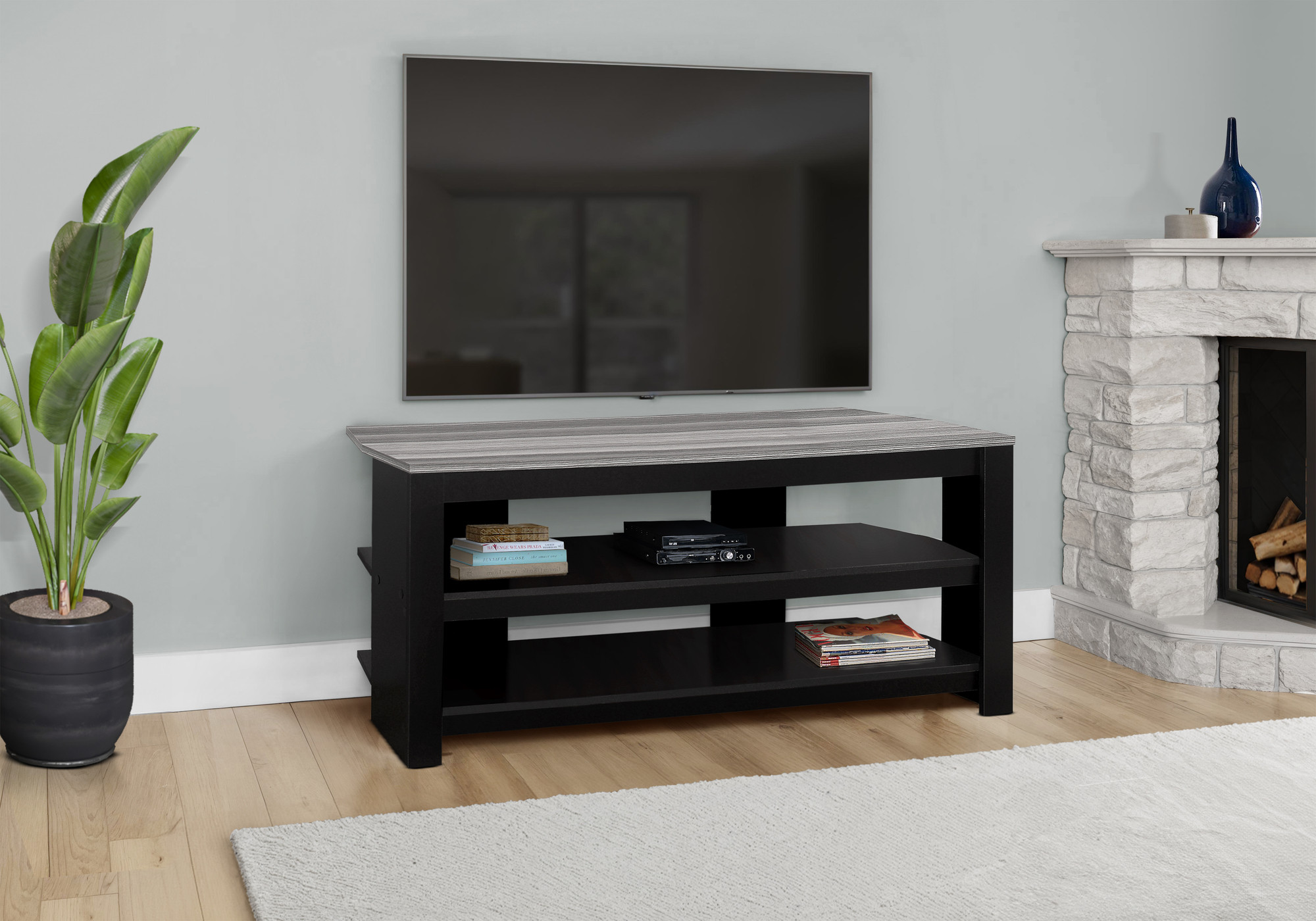 Ready to be enjoyed in your living room, family room, or recreation room, this 42-inch black and gray open shelving tv stand is a practical and good looking piece of furniture that will help to anchor your room. To add to the versatility, this piece features open non-concealed storage that can be used for not only storage but display as well. Convert your room into a special place with your favorite collectibles and tv accessories that is suitable for living room, bedroom, or office. 19.75-inch H x 42-inch W x 15.5-inch D