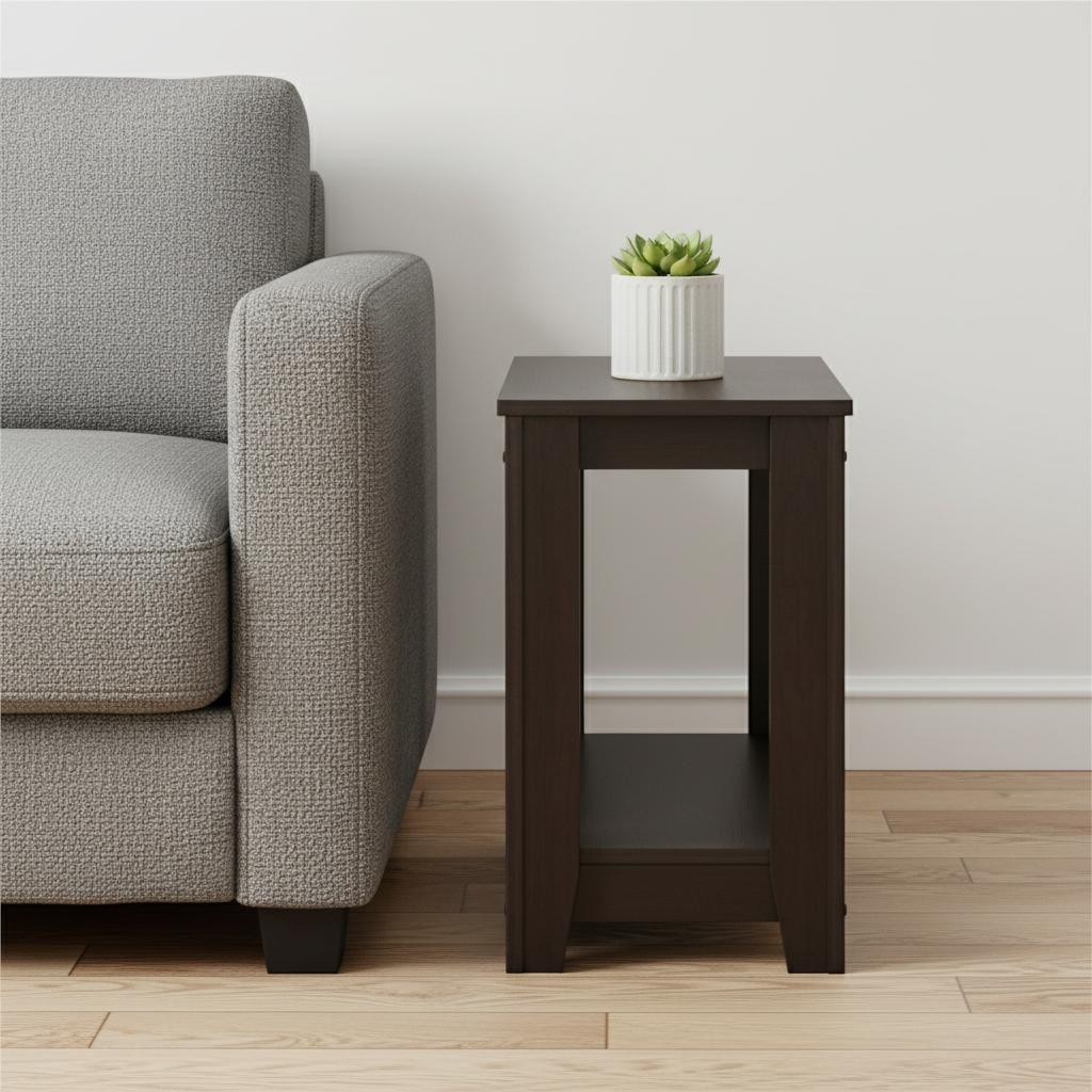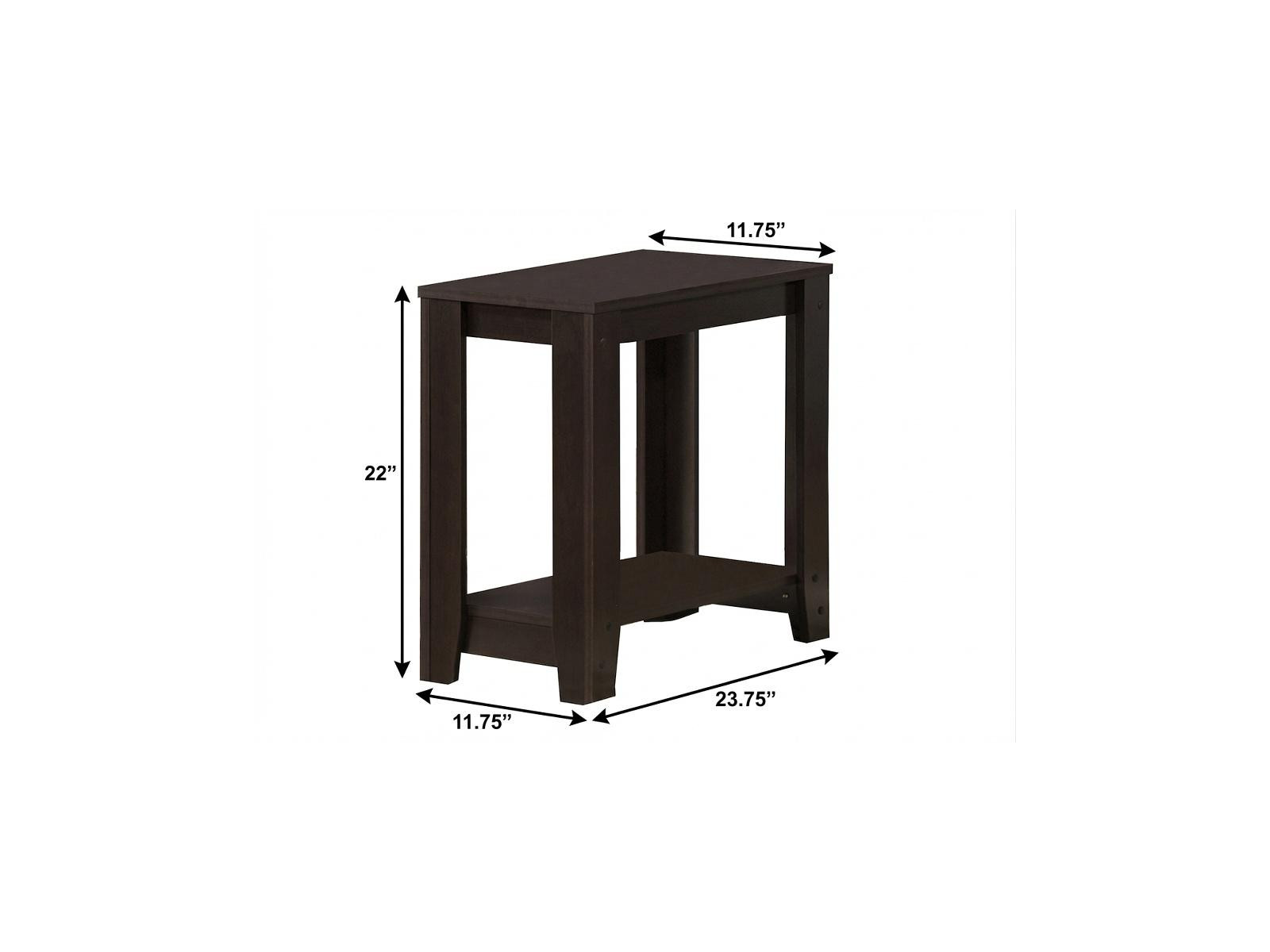 Optimize your space and add some charm to your room with the 22-inch dark brown end table with shelf. This table is made from manufactured wood in a dark brown color throughout the base and top. Includes a single shelf for handy storage or display space. An ideal location for placing your snacks and drinks, and a place to keep your lamp, frames, or other accessories. You can also use it as an entryway table to hold your keys. 22-inch H x 11.75-inch W x 23.75-inch D
