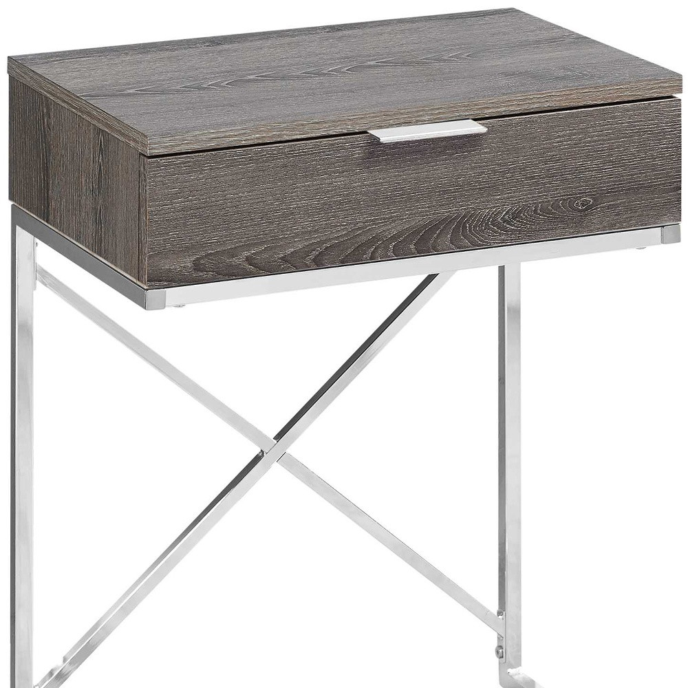 Distinctive in style the 24-inch silver and taupe end table with drawer radiates a versatile charm. The taupe manufactured wood top of this table is a nice contrast to the high quality, silver metal of the base. Includes a single easy pull out drawer for handy storage of life's little essentials. An ideal location for placing your snacks and drinks, and a place to keep your lamp, frames, or other accessories. You can match it with other pieces to get the ideal look for your place. 23.5-inch H x 18.2-inch W x 12.8-inch D