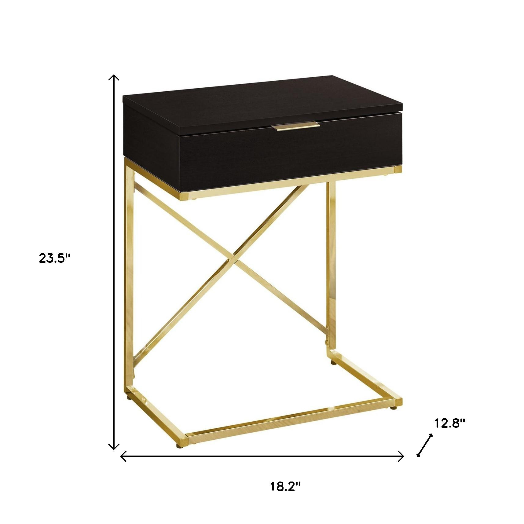 Show off your exquisite taste with this 24-inch gold and black end table with drawer. The gold coloration of the high quality metal base marries nicely with the black manufactured wood top. Includes a single easy pull out drawer for handy storage of life's little essentials. A great accent on either side of the sofa or bed, this adorable end or side table is just what you need. You can also use it as an entryway table to hold your keys. 23.5-inch H x 18.2-inch W x 12.8-inch D