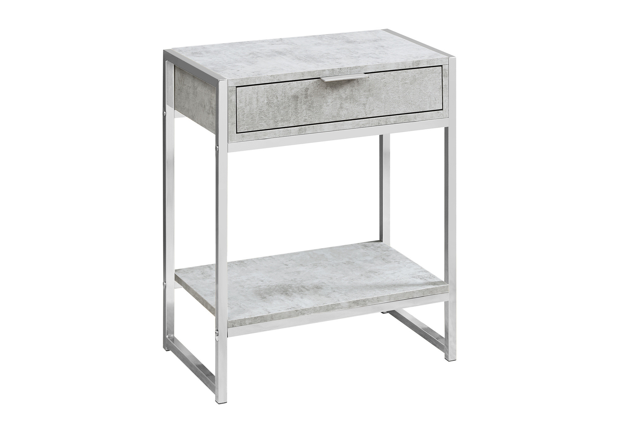 Optimize your space and add some charm to your room with the 24-inch silver and gray end table with drawer and shelf. The silver coloration of the high quality metal base marries nicely with the gray manufactured wood top. Includes a single shelf for handy storage or display space. Includes a single easy pull out drawer for handy storage of life's little essentials. Side tables are a great way to flank your sofa, use as an accent next to your favorite chair, or can even be used bedside. This versatile table is a great accent for most any room. 23.75-inch H x 12.75-inch W x 19.5-inch D