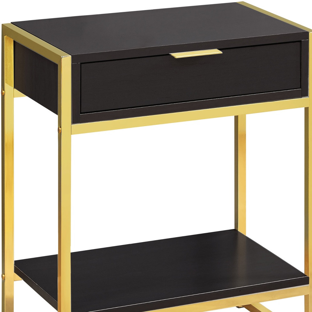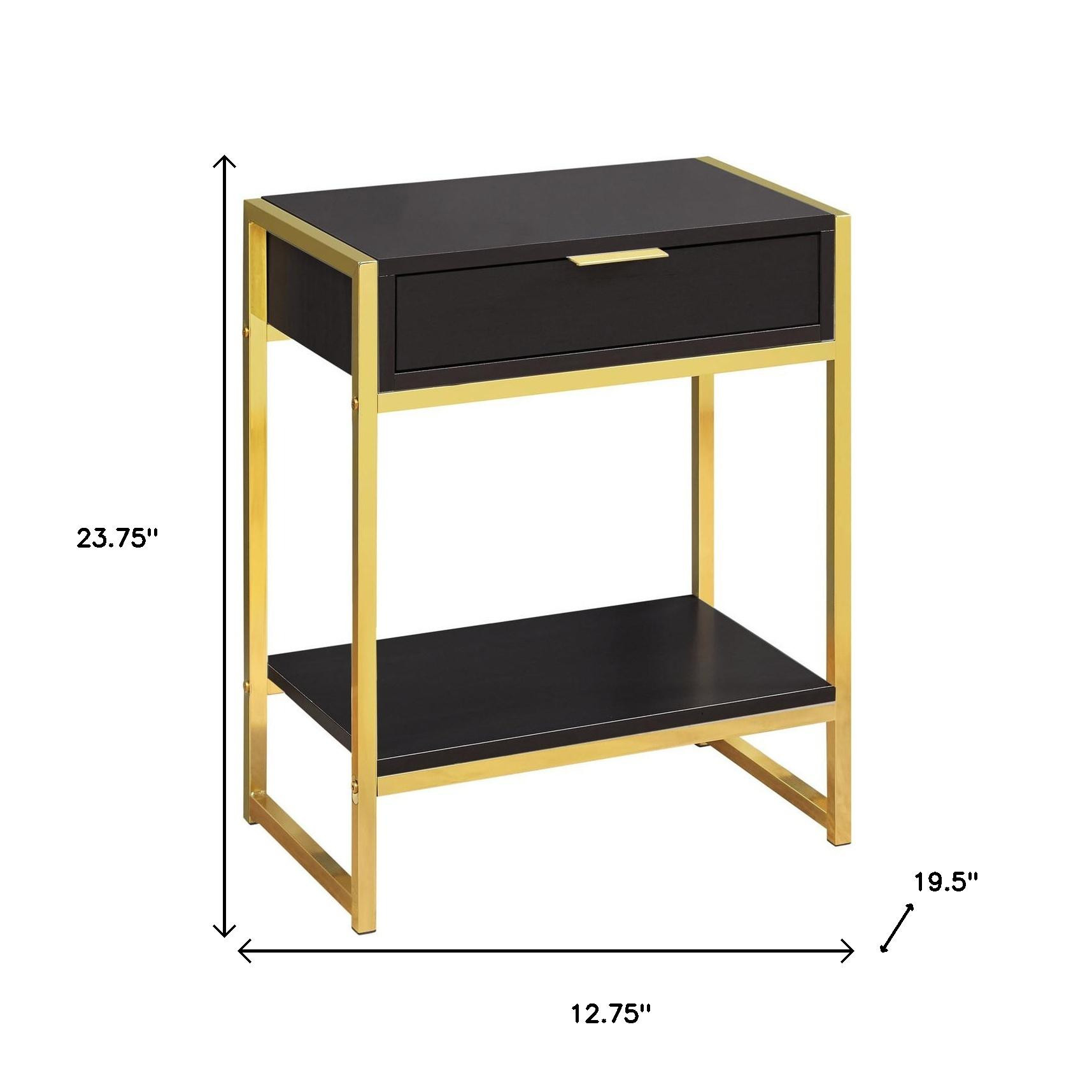 Distinctive in style the 24-inch gold and dark brown end table with drawer and shelf radiates a versatile charm. The base of this table is made from metal in a gold color that is a nice contrast to the dark brown manufactured wood tabletop. Includes a single shelf for handy storage or display space. Includes a single easy pull out drawer for handy storage of life's little essentials. Side tables are a great way to flank your sofa, use as an accent next to your favorite chair, or can even be used bedside. You can match it with other pieces to get the ideal look for your place. 23.75-inch H x 12.75-inch W x 19.5-inch D