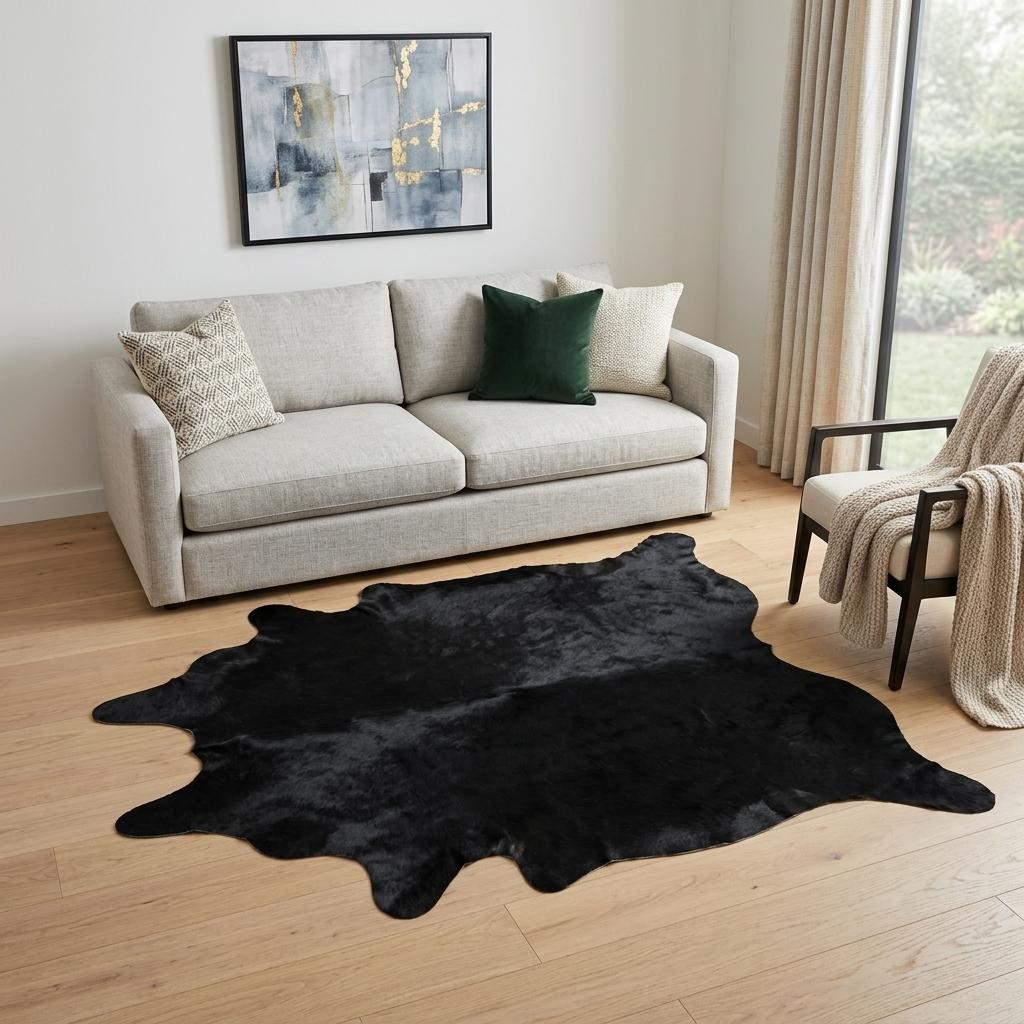 Add great coloration and comfortable texture to your space with this 6-foot x 7-foot black cowhide handmade area rug. Ideal for spaces with kids and pets, this rug is stain resistant to help repel dirt and spilled liquids. Crafted from cowhide fibers that give this piece premium texture, refinement, and appeal. Rugs are a great way to showcase your style, hide imperfections, warm your home and reduce noise. This larger sized, transitional styled rug is ready to create a focal point or statement piece in your room. 78-inch h x 90-inch w x 0.13-inch d.