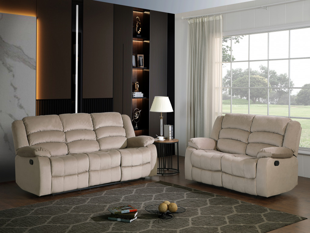 Step into a world of unparalleled seating comfort that is sure to dazzle even the toughest critic with our remarkable two piece indoor beige microsuede five person seating set. Prepare to enter the realm of ultimate relaxation with this reclining sofa that offers unparalleled comfort and luxurious lounging. Discover the perfect seating solution with a seating set featuring microsuede that are both durable, ensuring longevity, and comfortable, providing endless hours of coziness. The presence of coil spring seat construction helps distribute weight evenly, reducing pressure points and enhancing overall comfort by minimizing the strain on specific areas of the body. The inclusion of a loveseat into your mix allows a fashionable seating option in a compact design. Gather with family and loved ones with this seating set that will bring you all together. 40-inch H x 60-inch W x 35-inch D