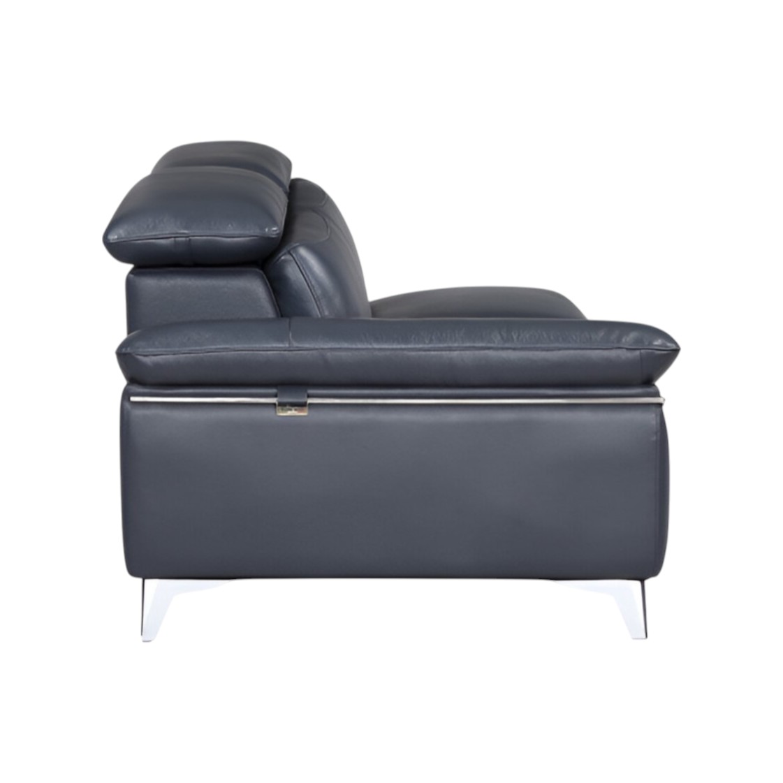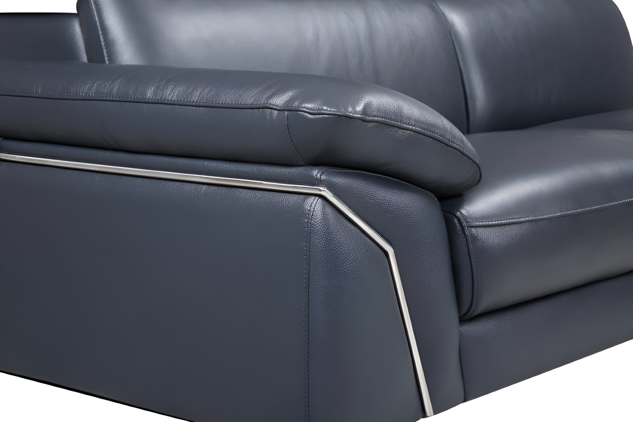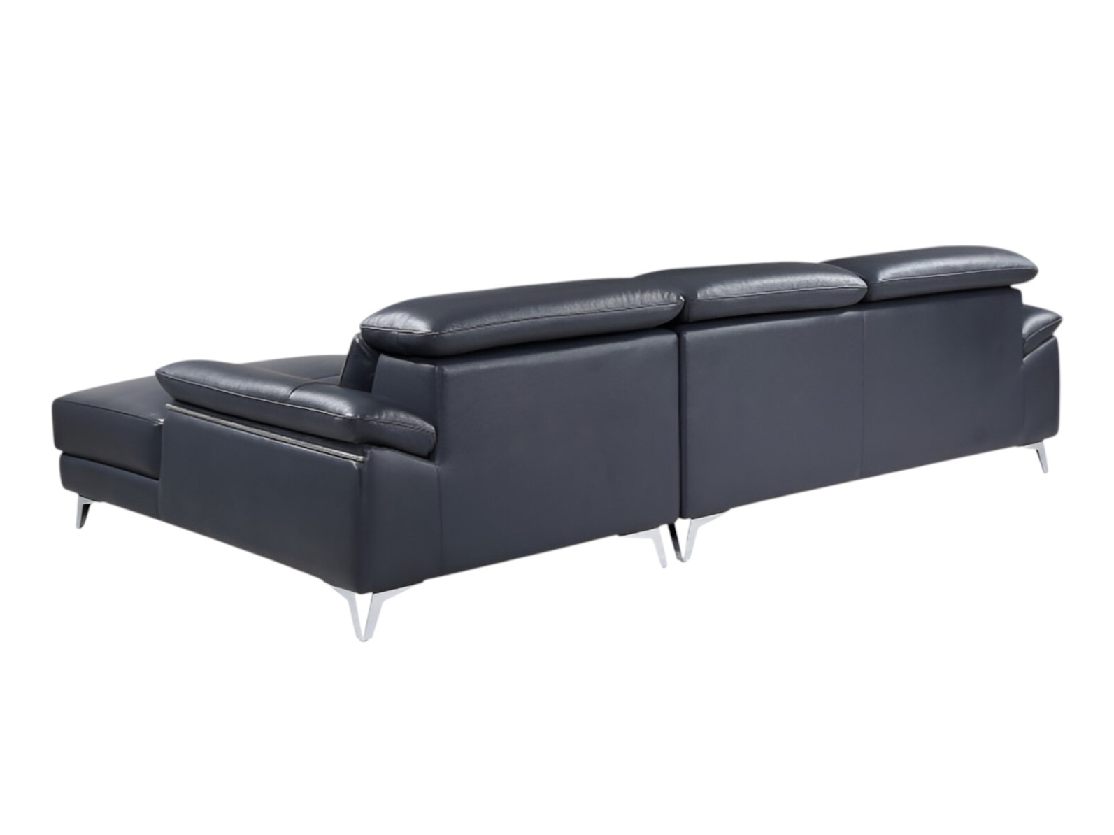 An interior designer's dream, this buttery soft high-grade leather navy blue italian leather l shaped two piece sofa and chaise sectional will bring just the right touch to your space. The premium leather used makes your lounging luxuriously comfortable and adds an elegant appeal to your space. Solid colors give you lots of decorative options and are easy to work into your decor scheme. Silver metal legs effortlessly elevate the room and add a touch of contemporary design. A great showpiece for your room, this sectional is a must have. 39-inch H x 114-inch W x 67-inch D